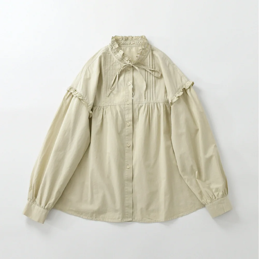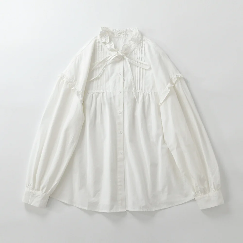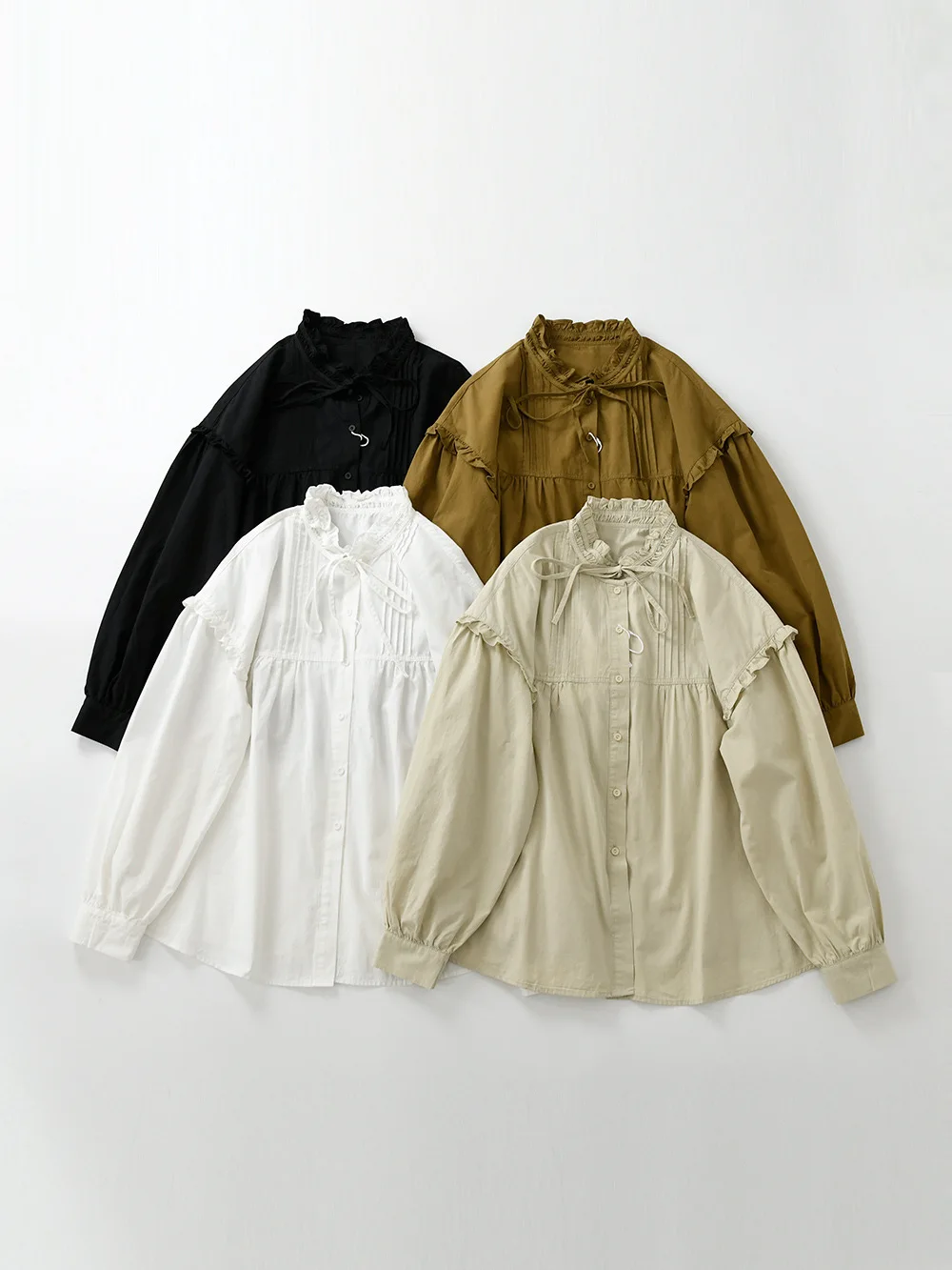 100% Cotton Vintage Elegant Chic Long Puff Sleeve Ruffled Collar Loose Blouse 2025 Fall Spring Sweet Victorian Edwardian Shirt