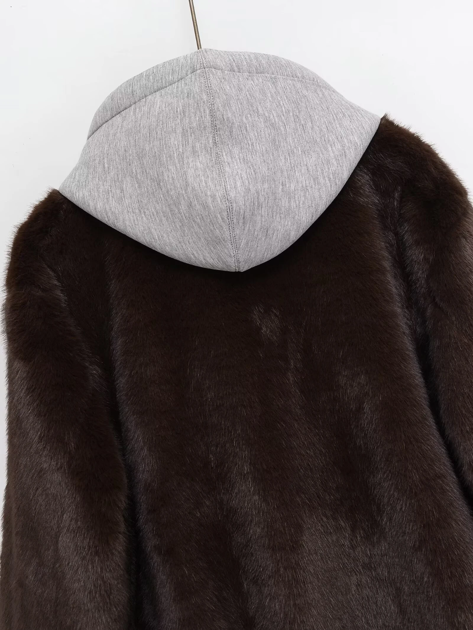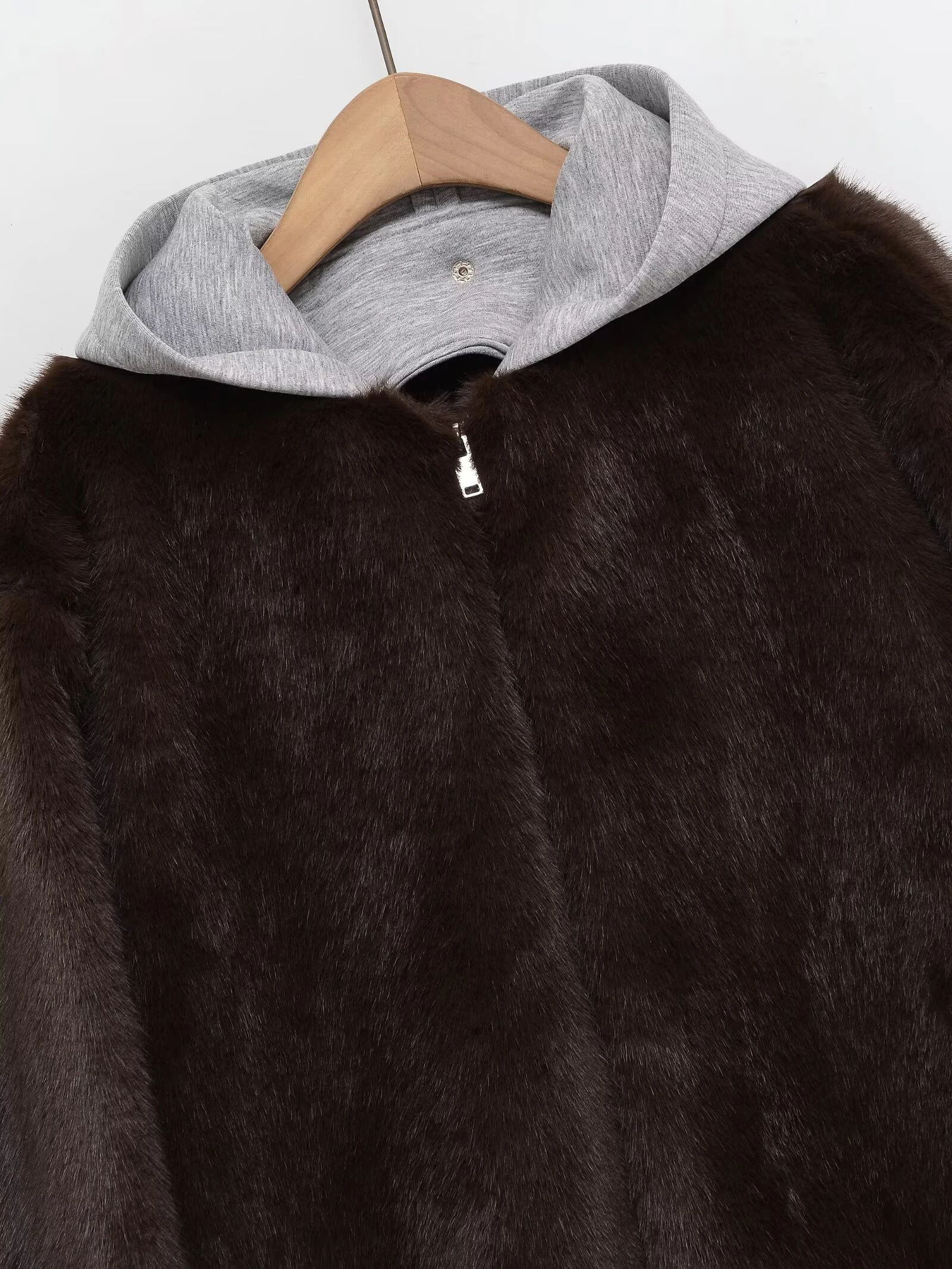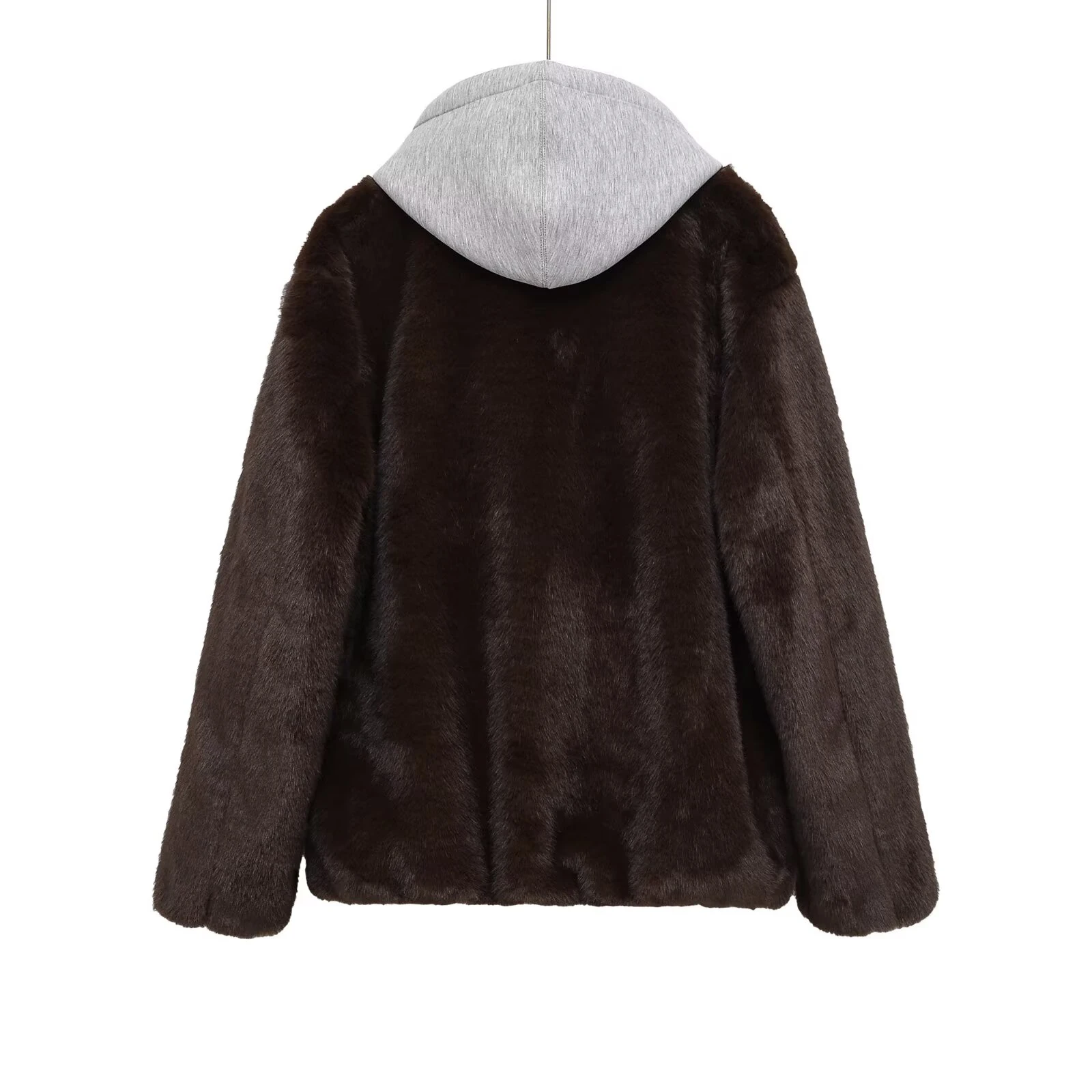 2025 Winter New Fashionable Sweet Loose Splicing Artificial Fur Zipper Hooded Jacket for Women