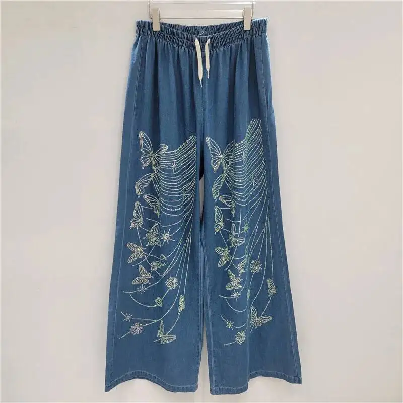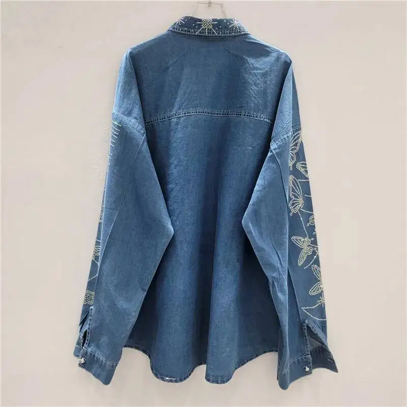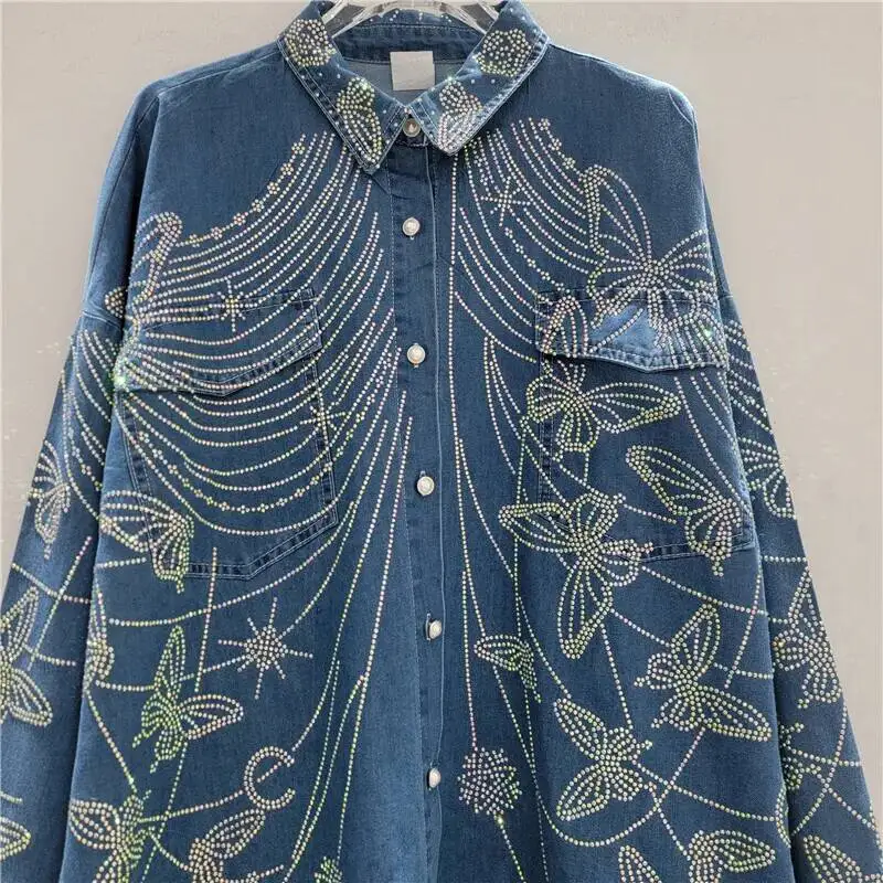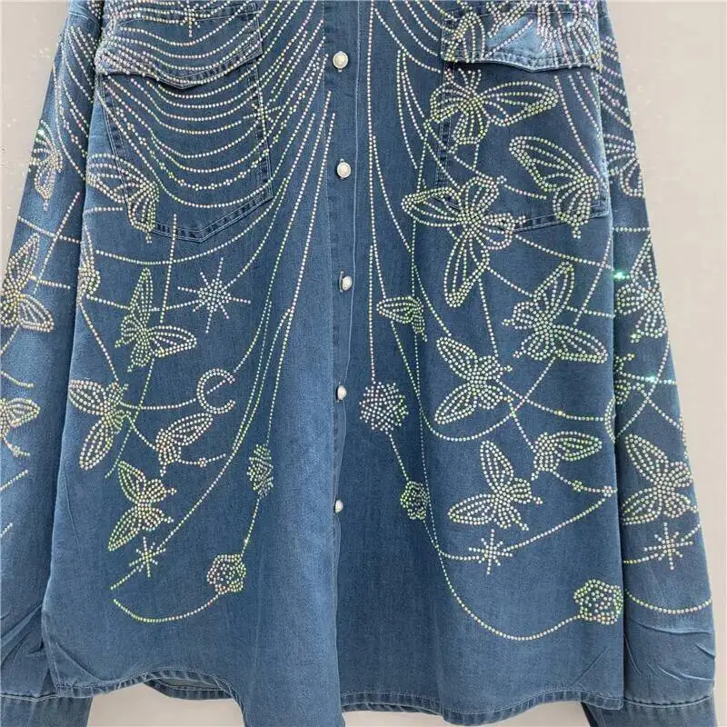 2026 Autumn New Heavy Industry Women's Two-pieces Set Diamond Design Denim Shirt Cardigan Loose Straight Casual Pants