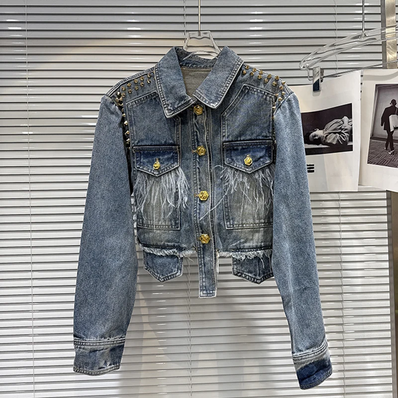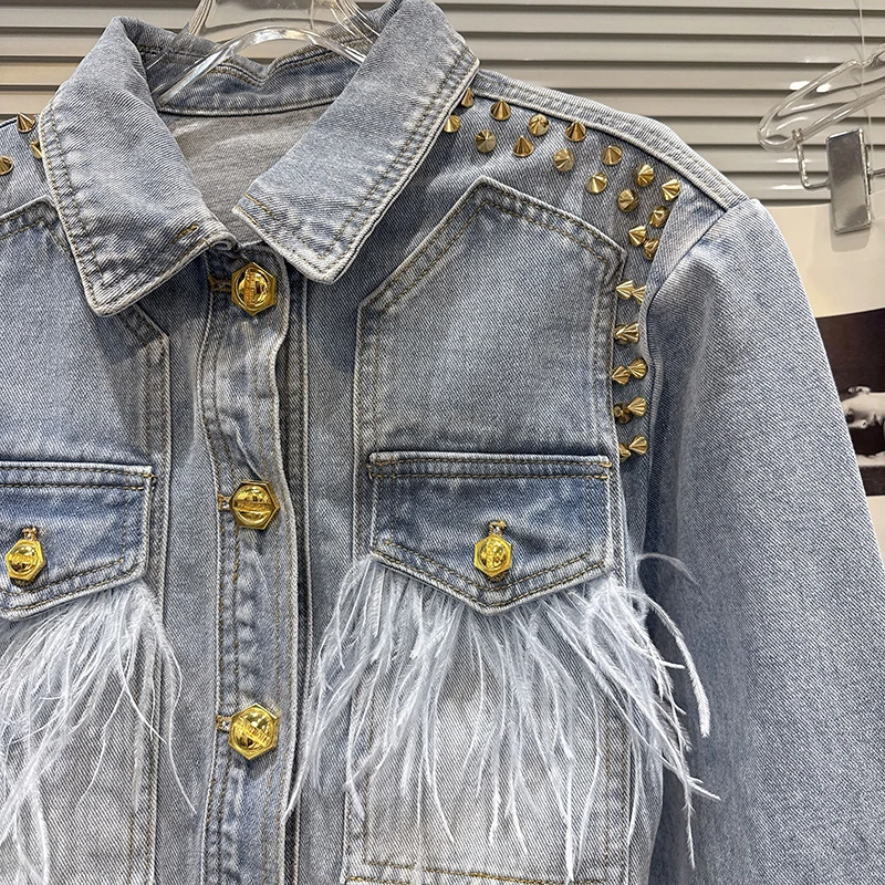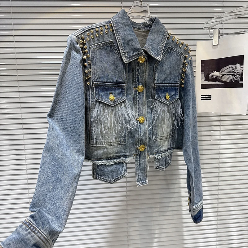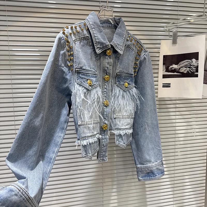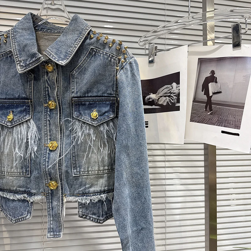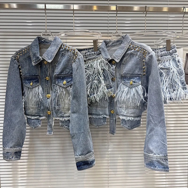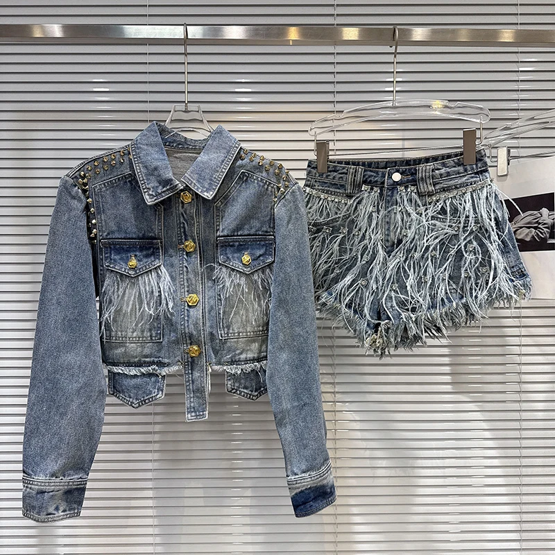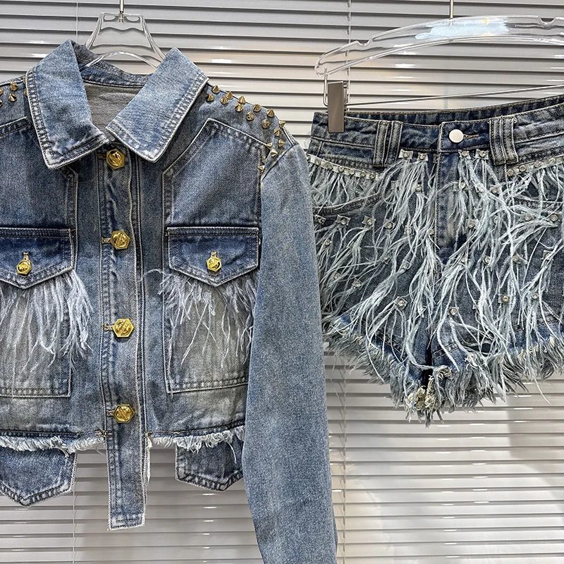 2026 Autumn New Street Style Heavy Industry Rivet Denim Jacket For Women Feather Beaded Wide-leg Shorts Female 11A06375