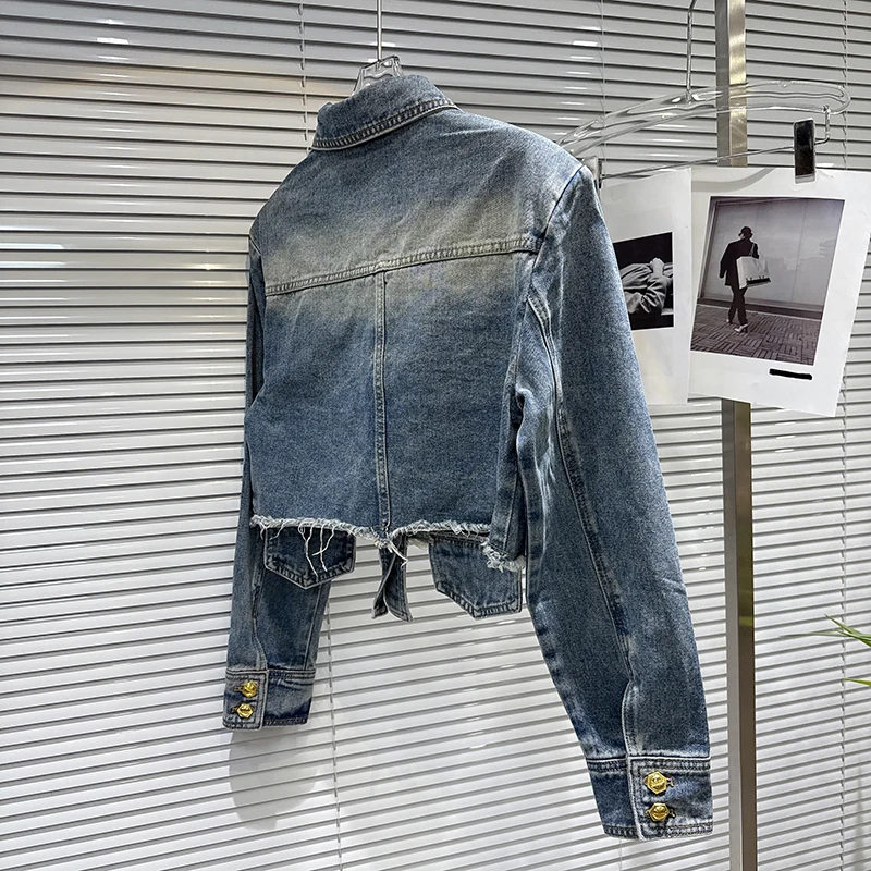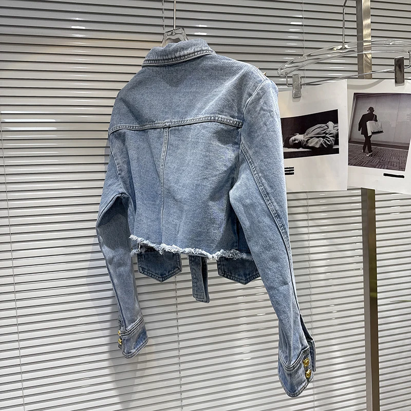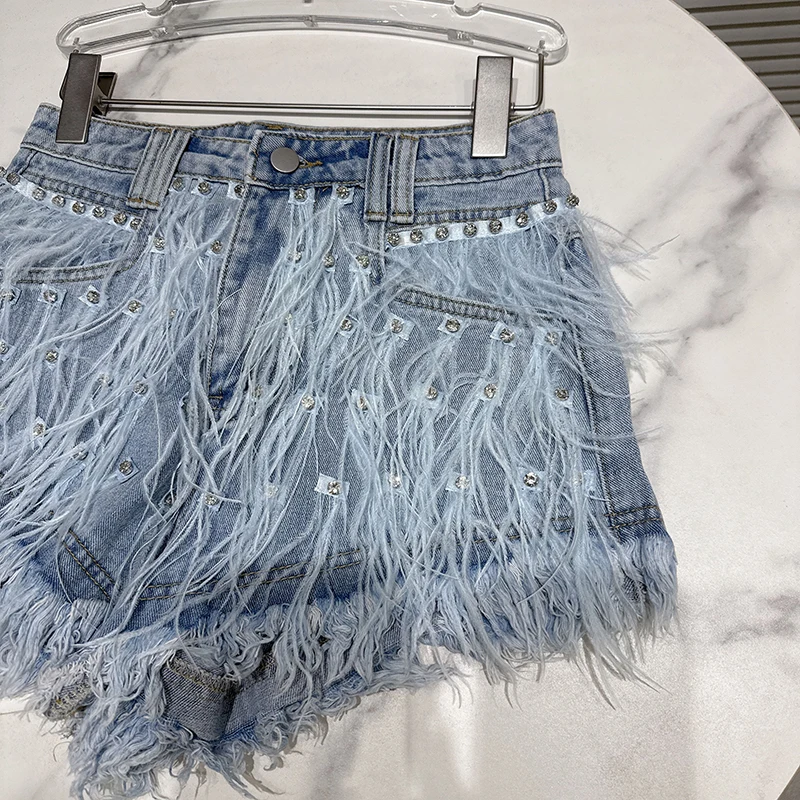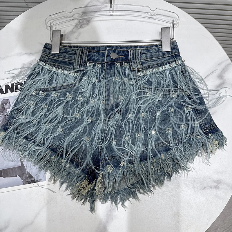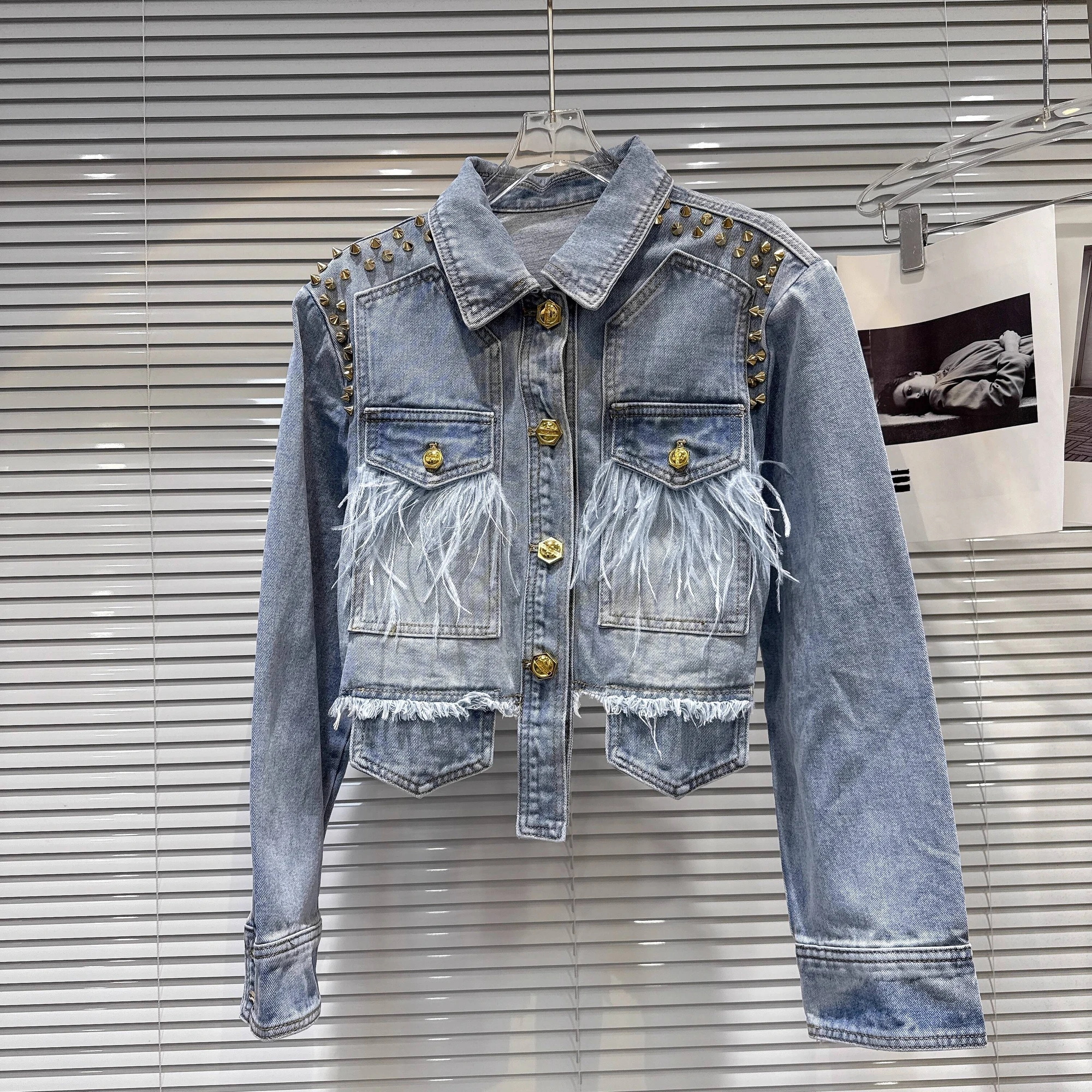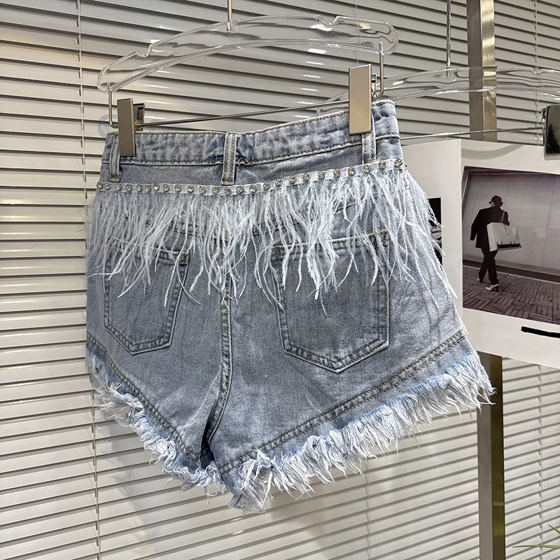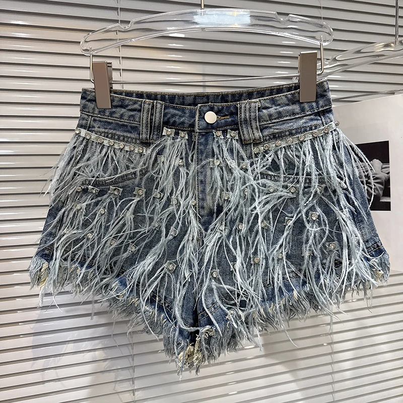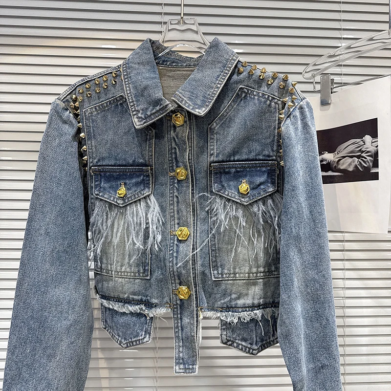 2026 Autumn New Street Style Heavy Industry Rivet Denim Jacket For Women Feather Beaded Wide-leg Shorts Female 11A06375