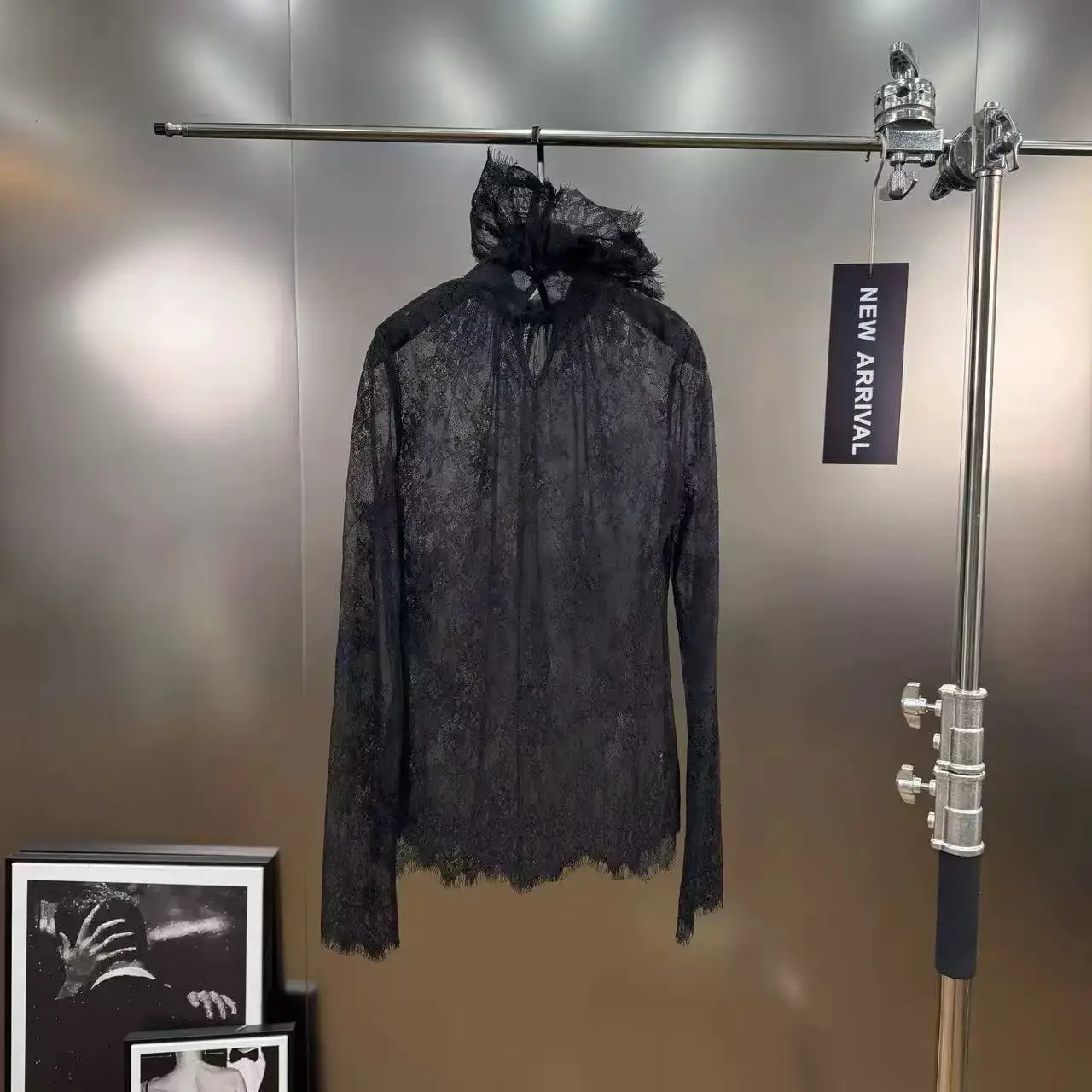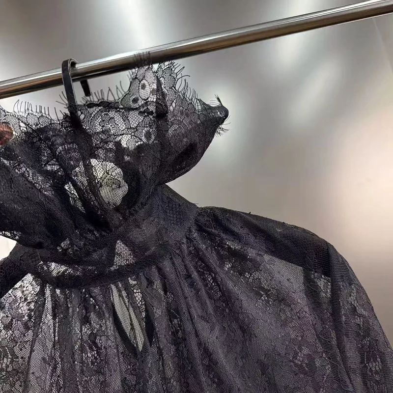 2026 Autumn Winter New Lace Style Black Stand Collar Long Sleeve Hollow Shirt For Women Versatile Blouse Female 1A1550