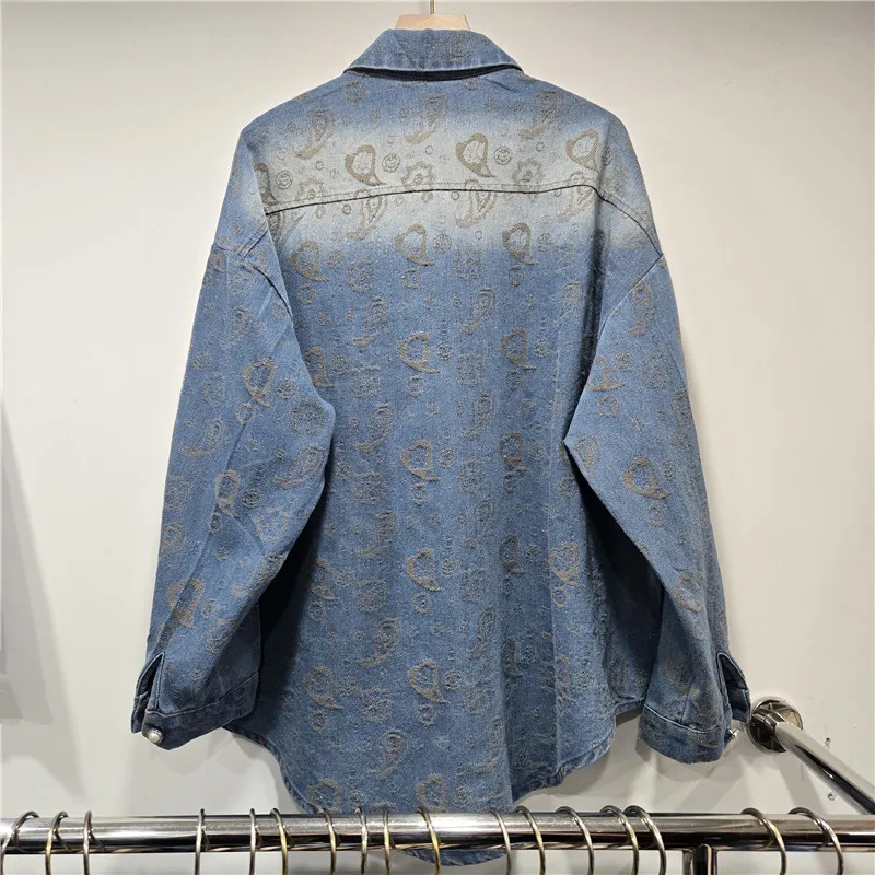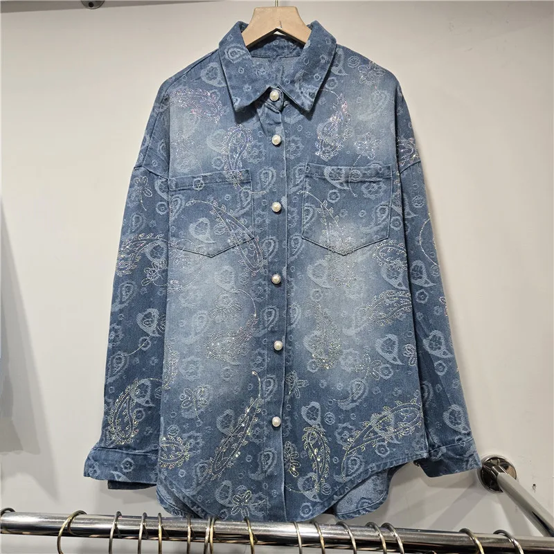 2026 Early Spring New Fashion Casual Regular Jacquard Rhinestone Denim Long Sleeve Shirt For Women Loose Style Top 11A08485