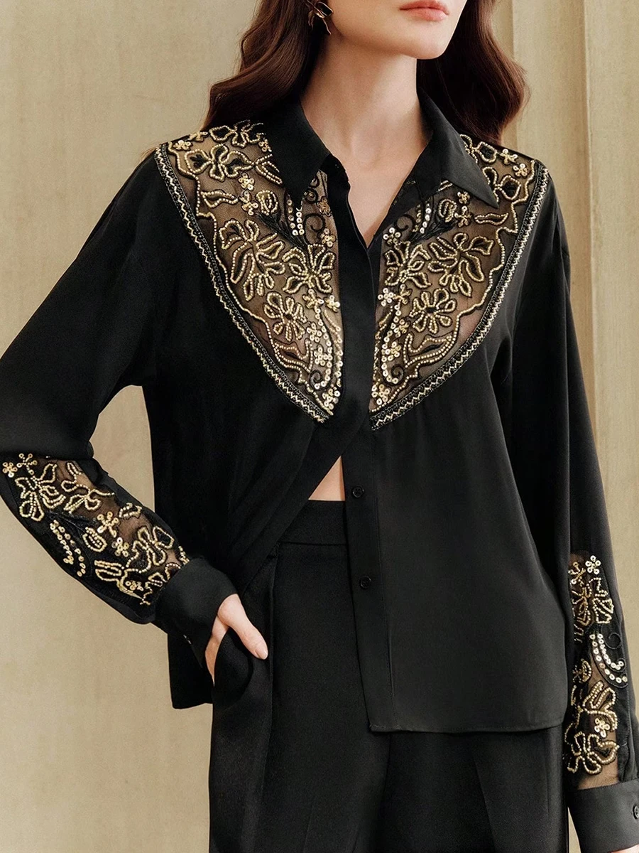 Elegant Business Meetings Black Shirt with Gold Embroidery for Women Spliced Sheer Mesh Slimming Shirts for Luxury Dinners