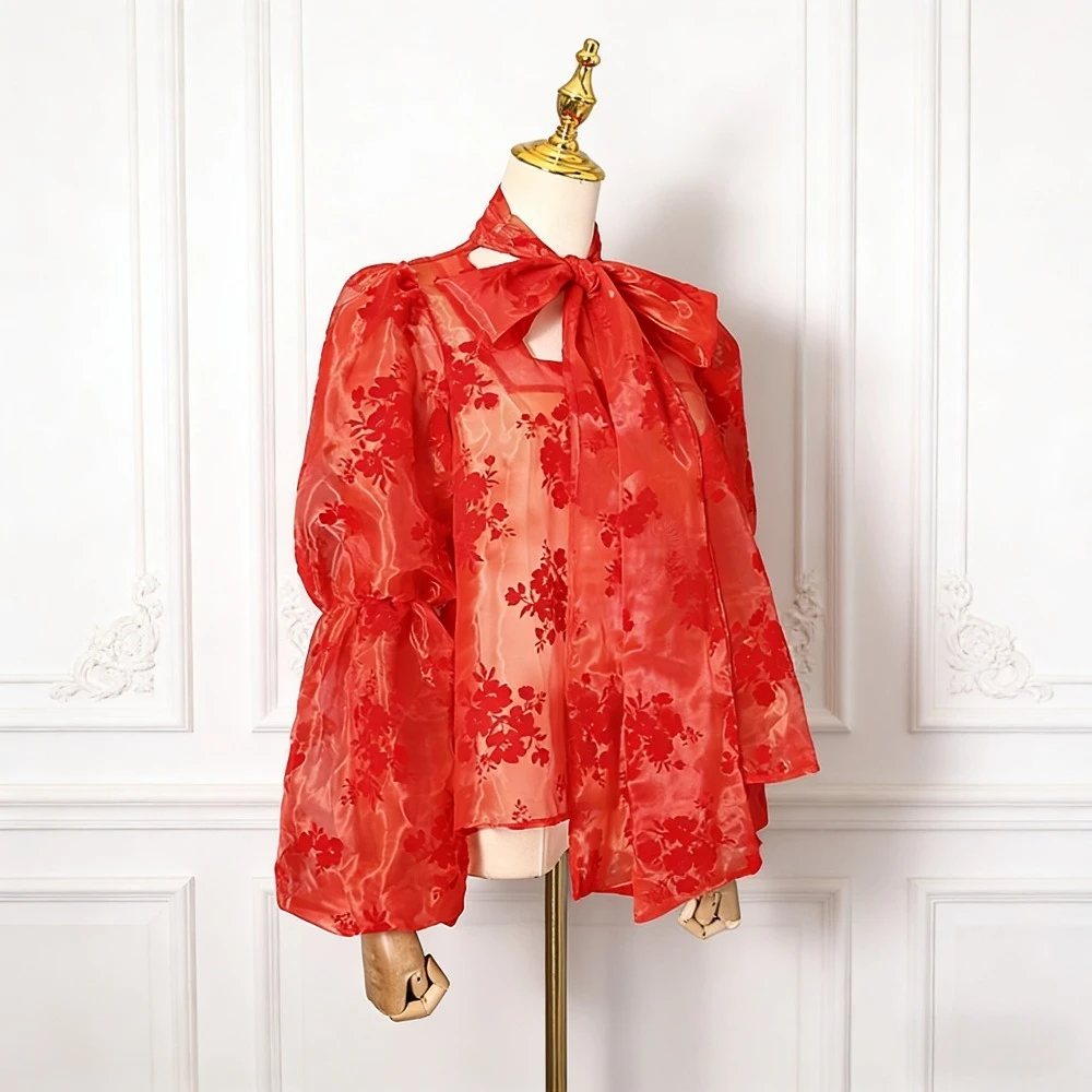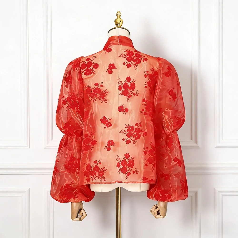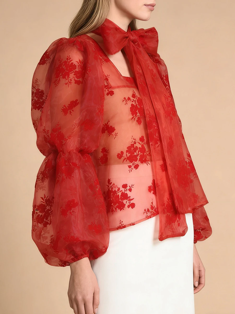 Elegant Floral Printing Chiffon Shirt for Women Scarf Collar Hollow Out Design Puff Sleeve Sheer Mesh Sexy Blouse Female New