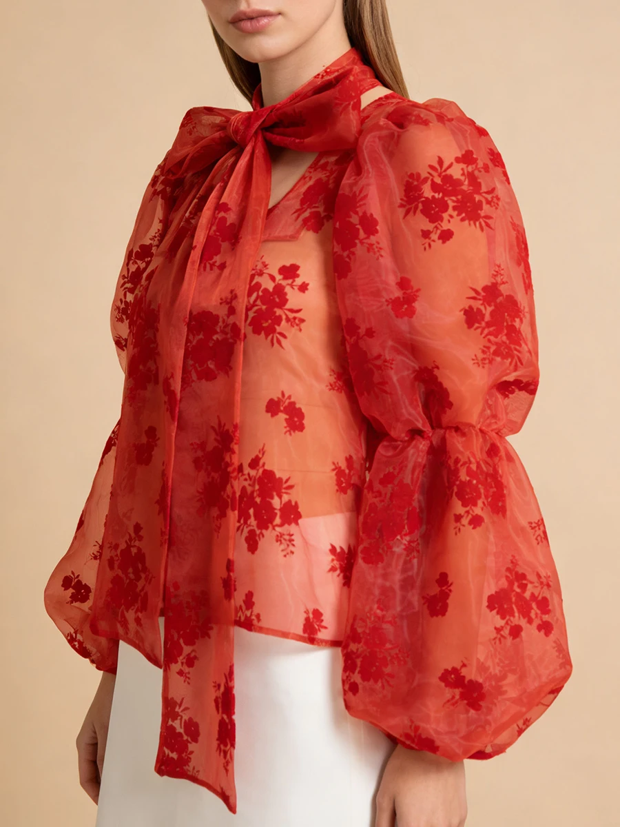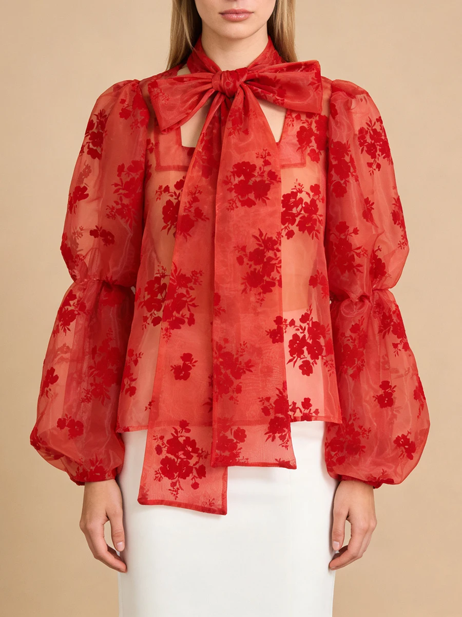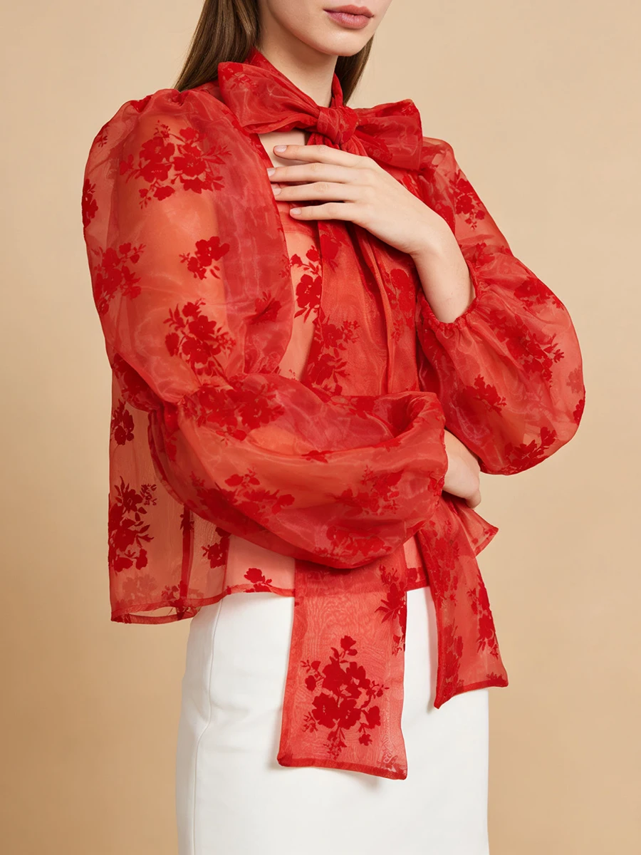 Elegant Floral Printing Chiffon Shirt for Women Scarf Collar Hollow Out Design Puff Sleeve Sheer Mesh Sexy Blouse Female New