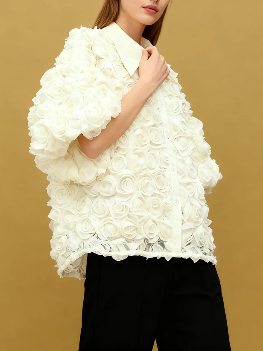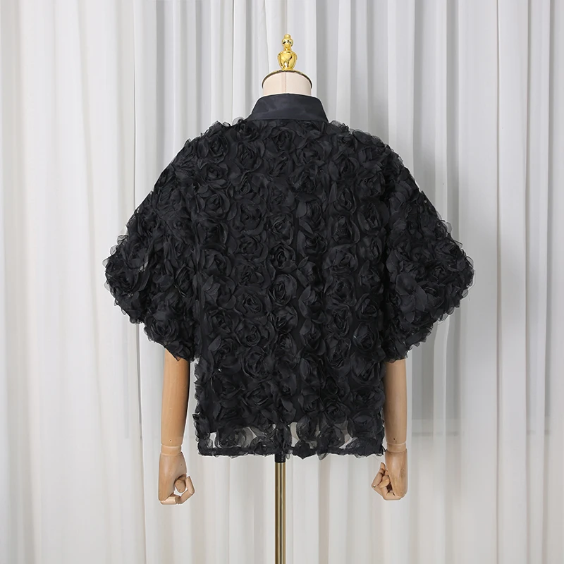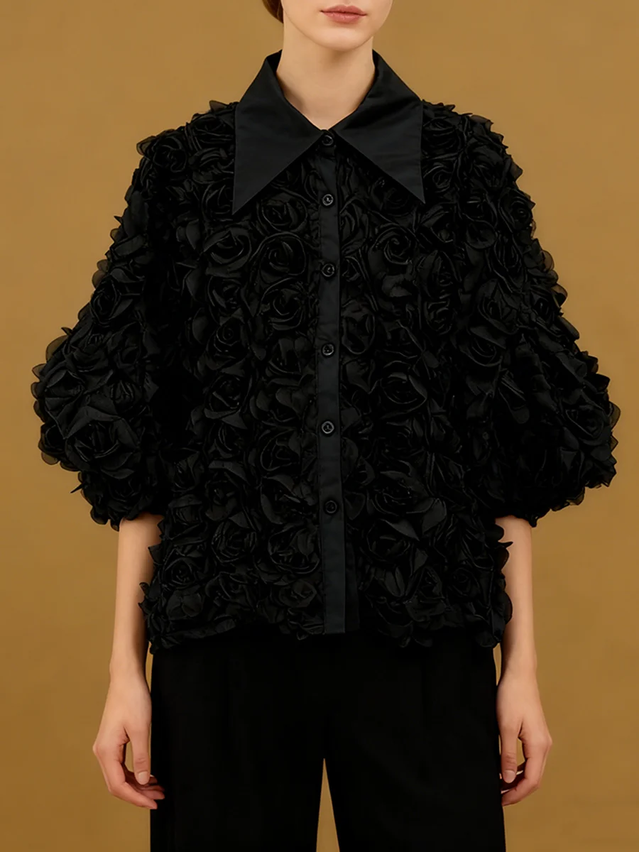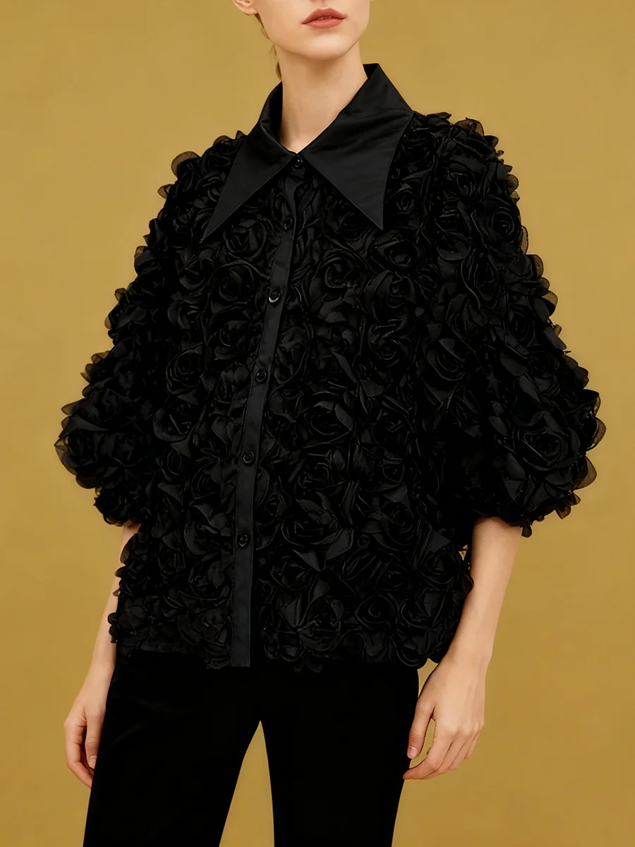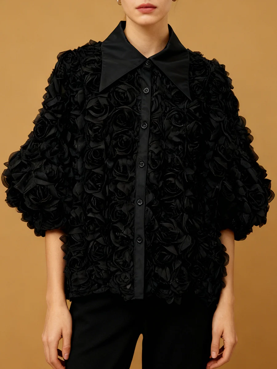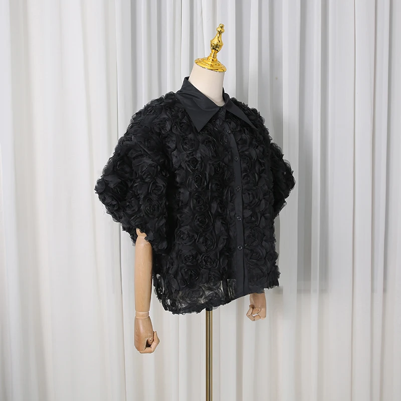 Elegant High End Style Shirts for Women Lapel Half Sleeve Patchwork Petal Stylish Temperament Black Shirt Female Spring New