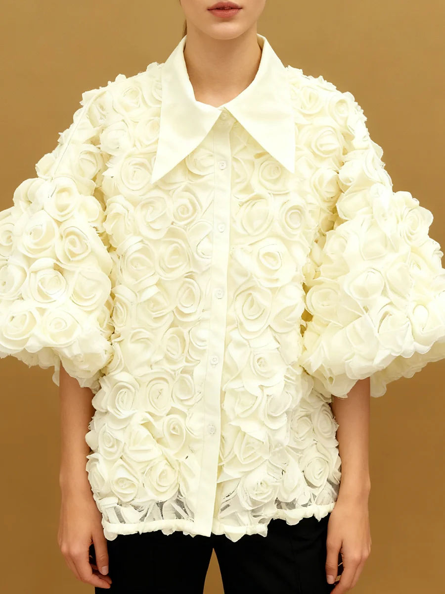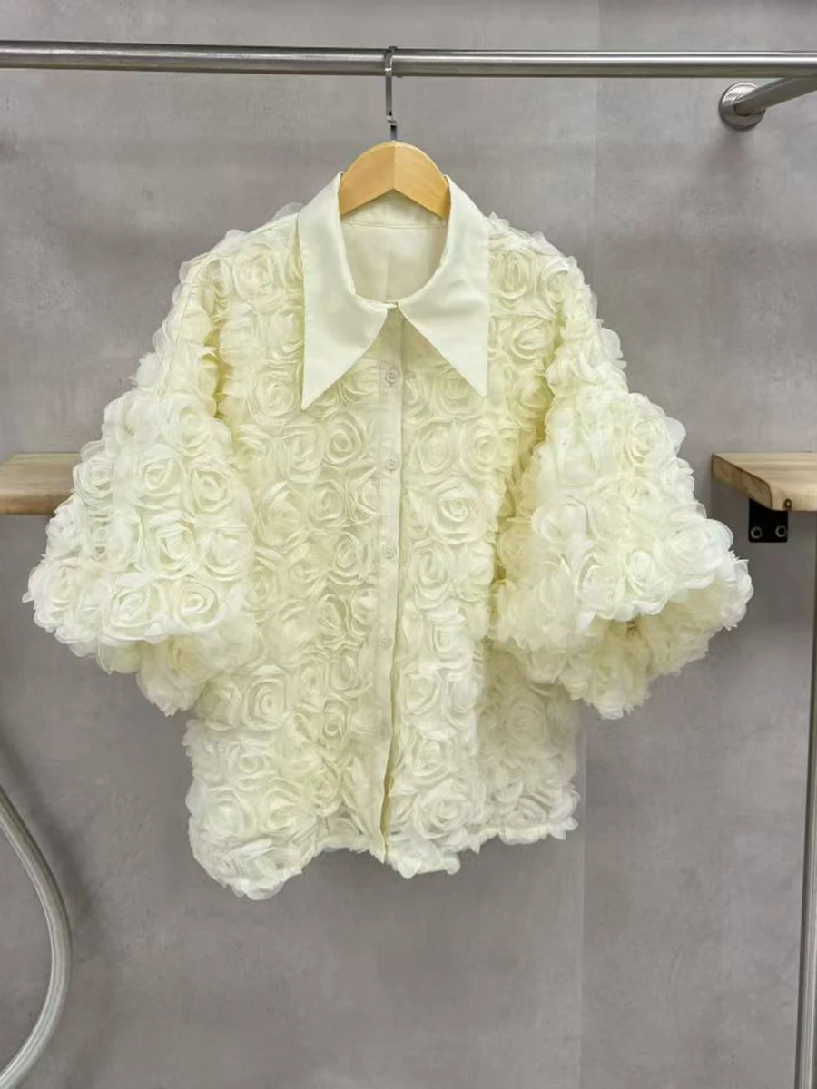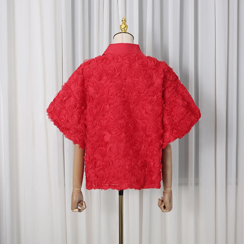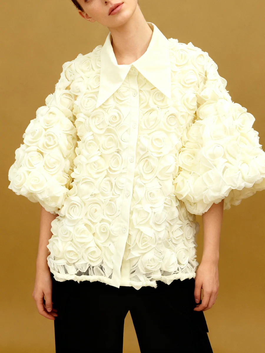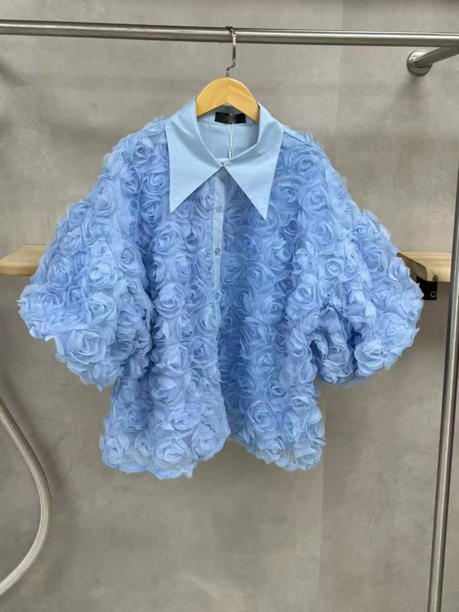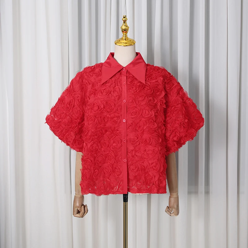 Elegant High End Style Shirts for Women Lapel Half Sleeve Patchwork Petal Stylish Temperament Black Shirt Female Spring New