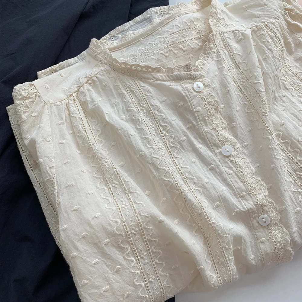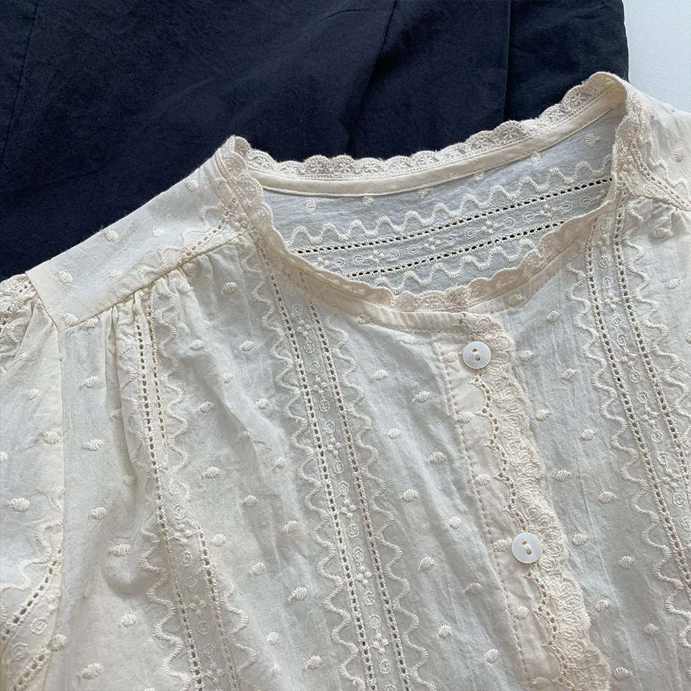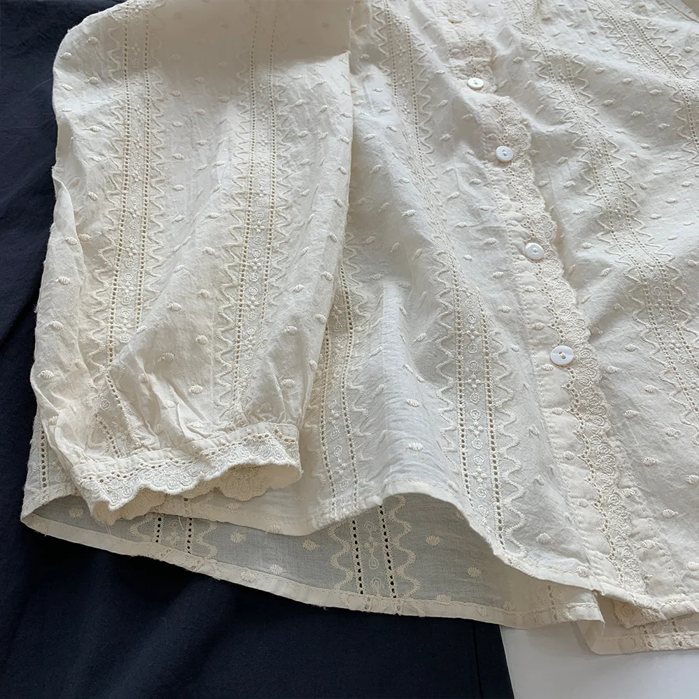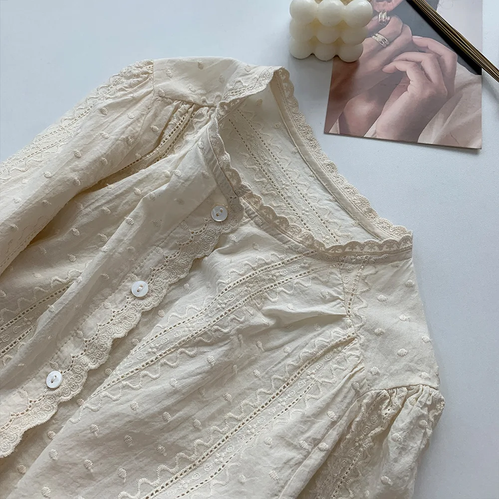 Fall Vintage Cotton Embroidery Lace Hollow Out Long Puff Sleeve Shirt Youth Retro Chic Classy Edwardian Rococo Elegant Blouse