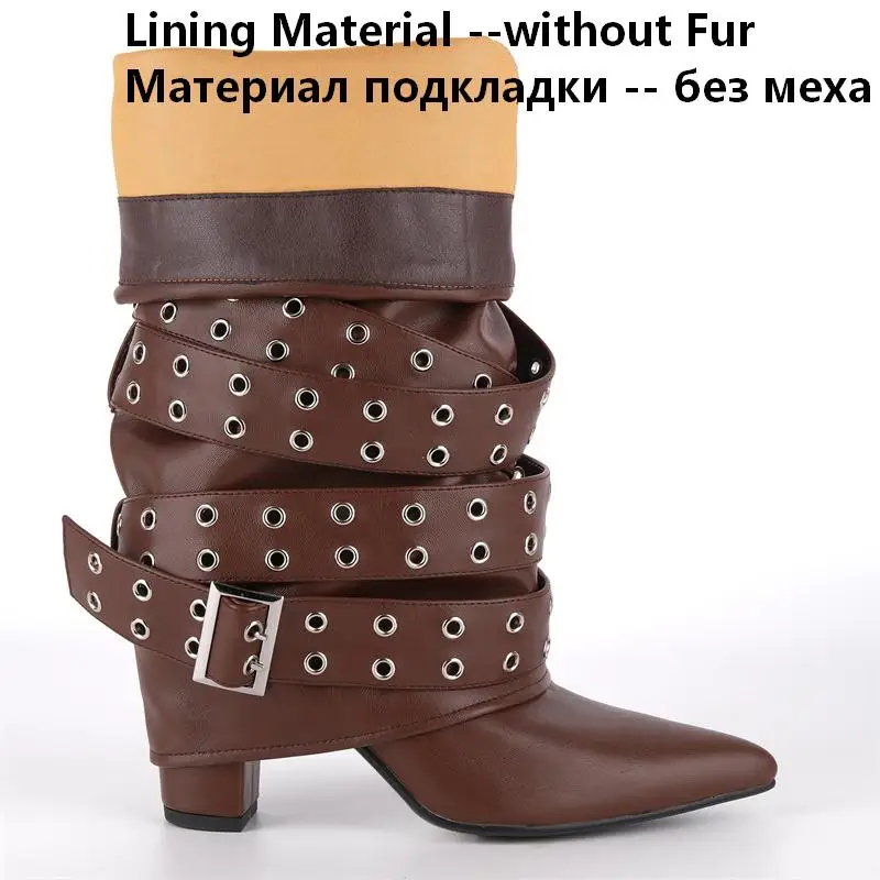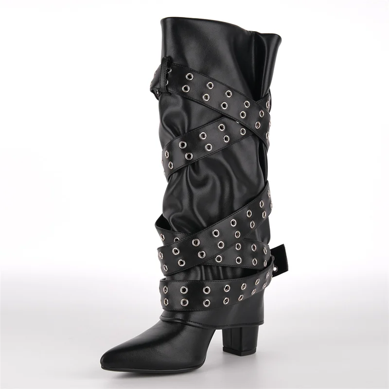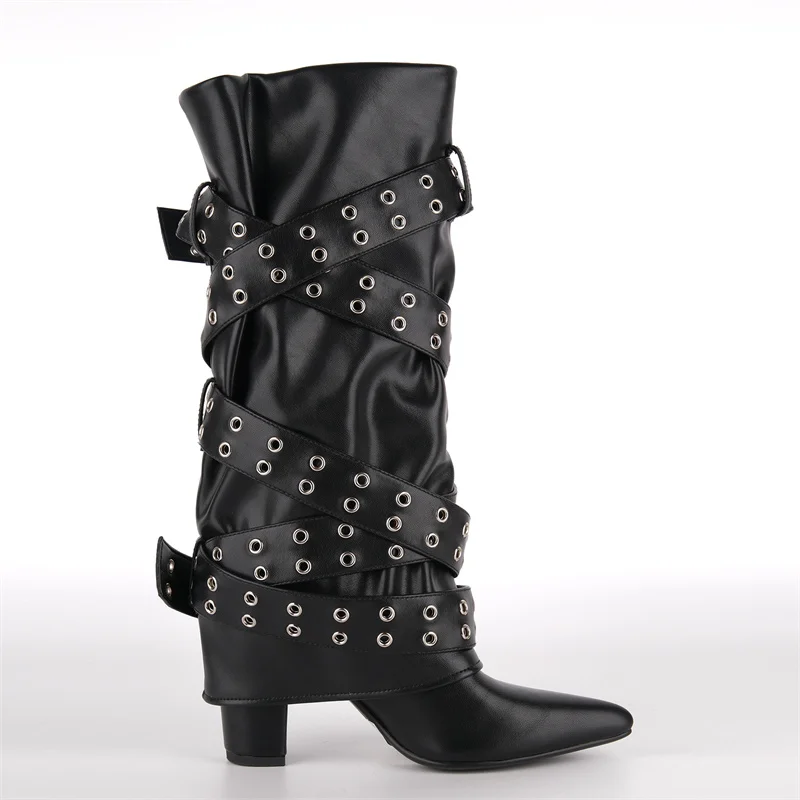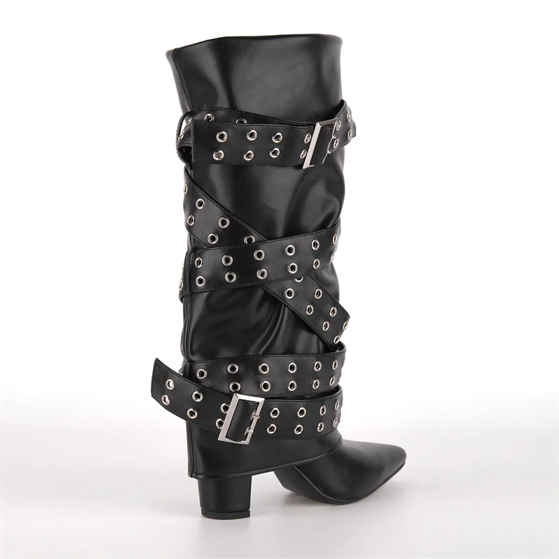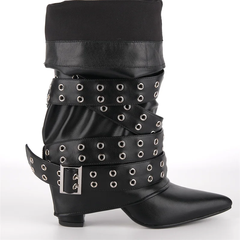 Pointed Toe Fold Over Buckle Strap Mid-Calf Boots Chunky Heel Shoes Autumn Solid Pull On Fashion Elegant Boots