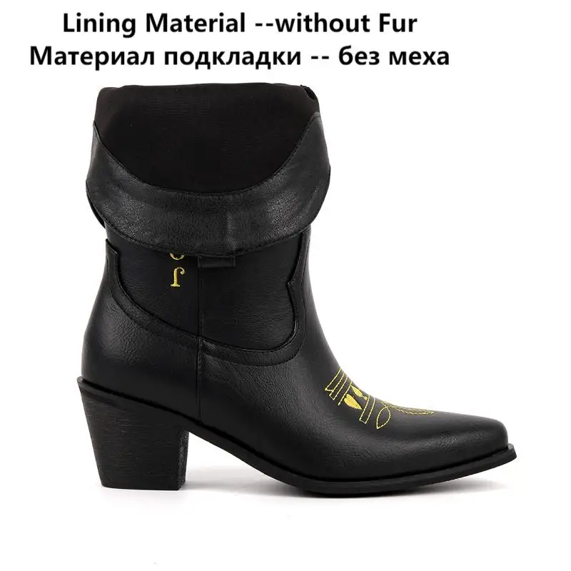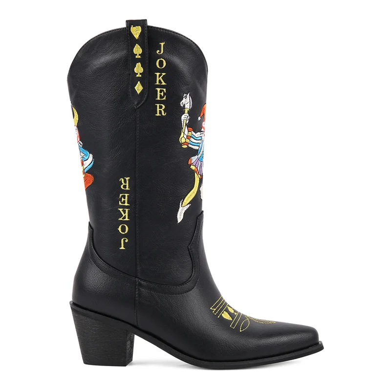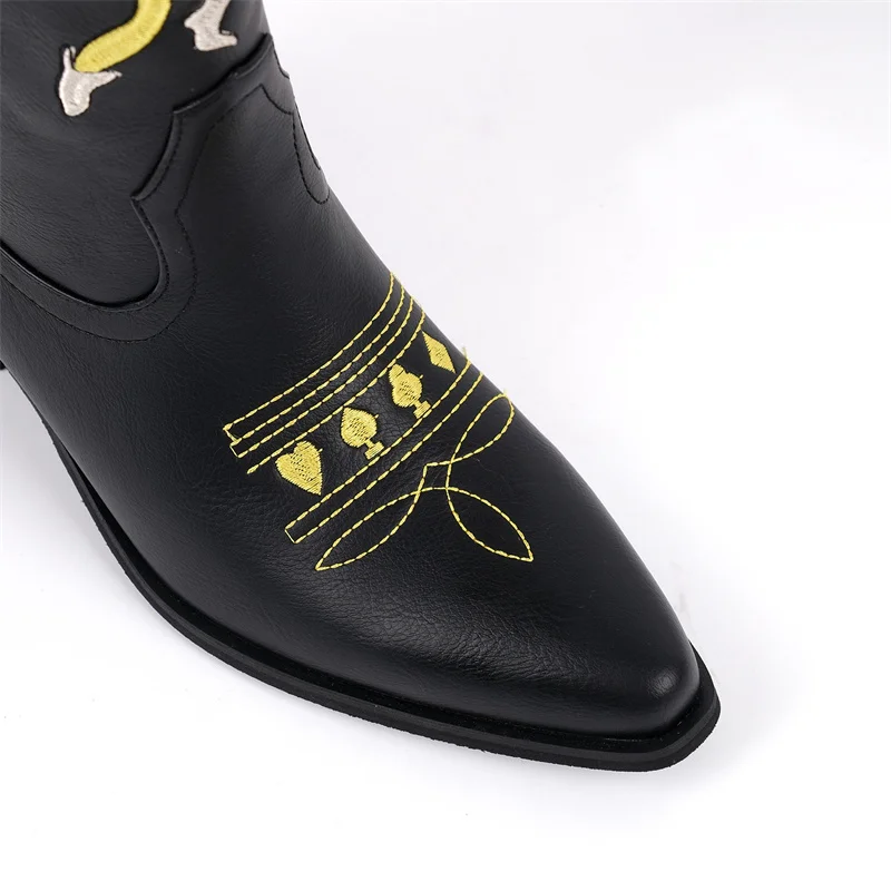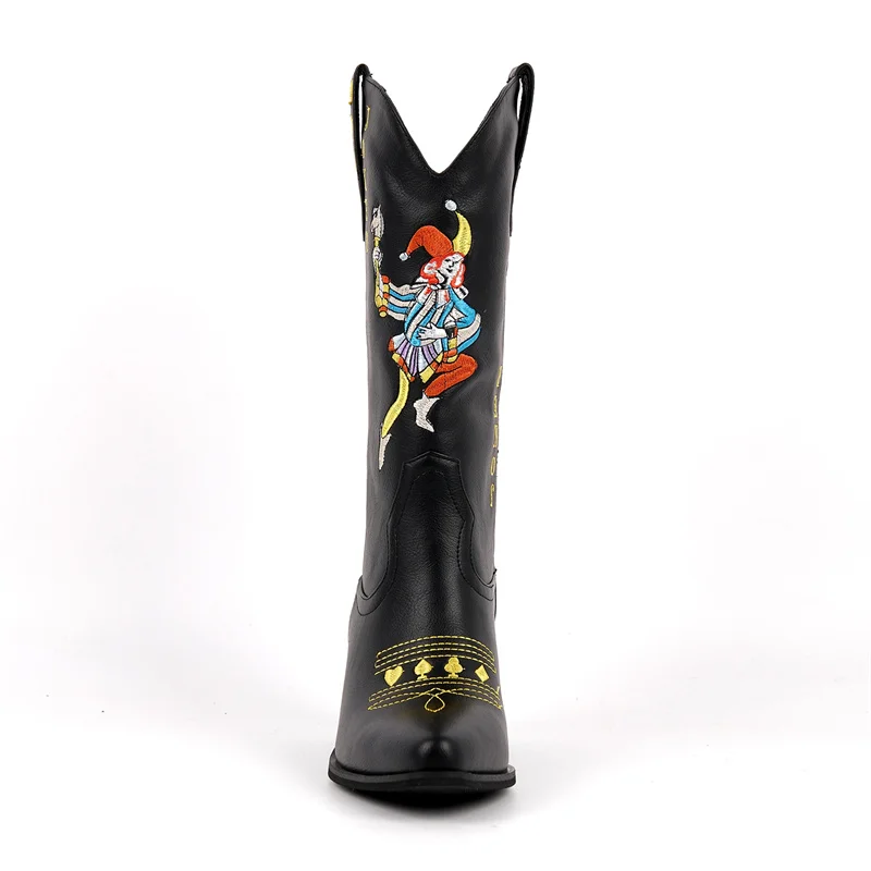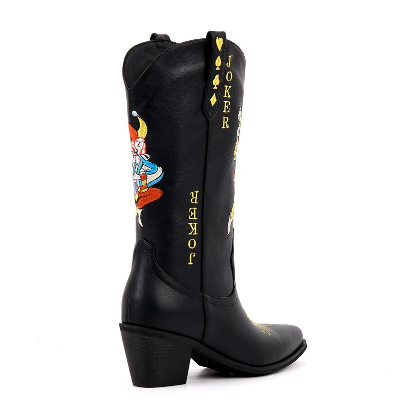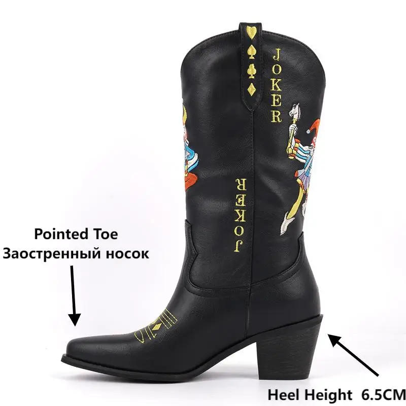 Women Matte Black Pointed Toe Joker Embroidery Mid-Calf Western Boots Big Size Block Heel Cowboy Boots