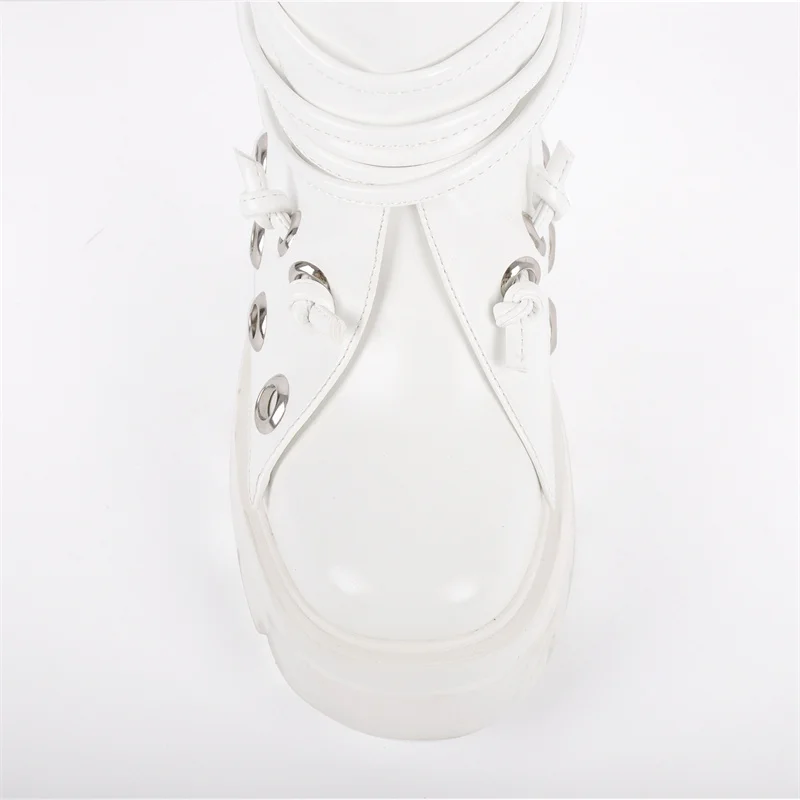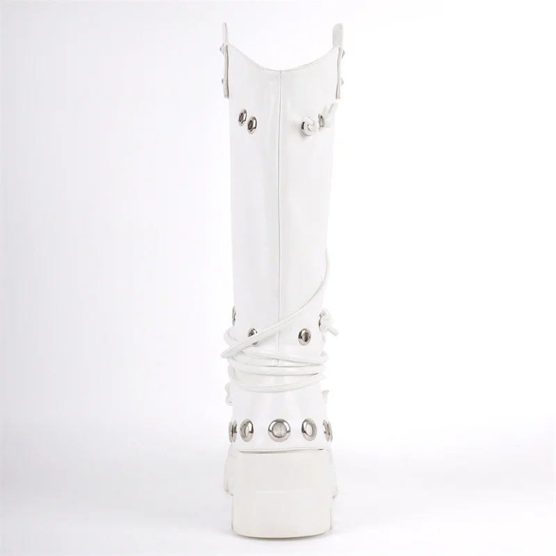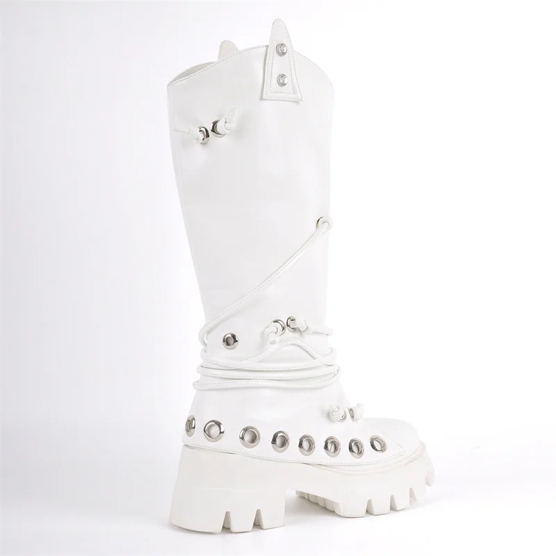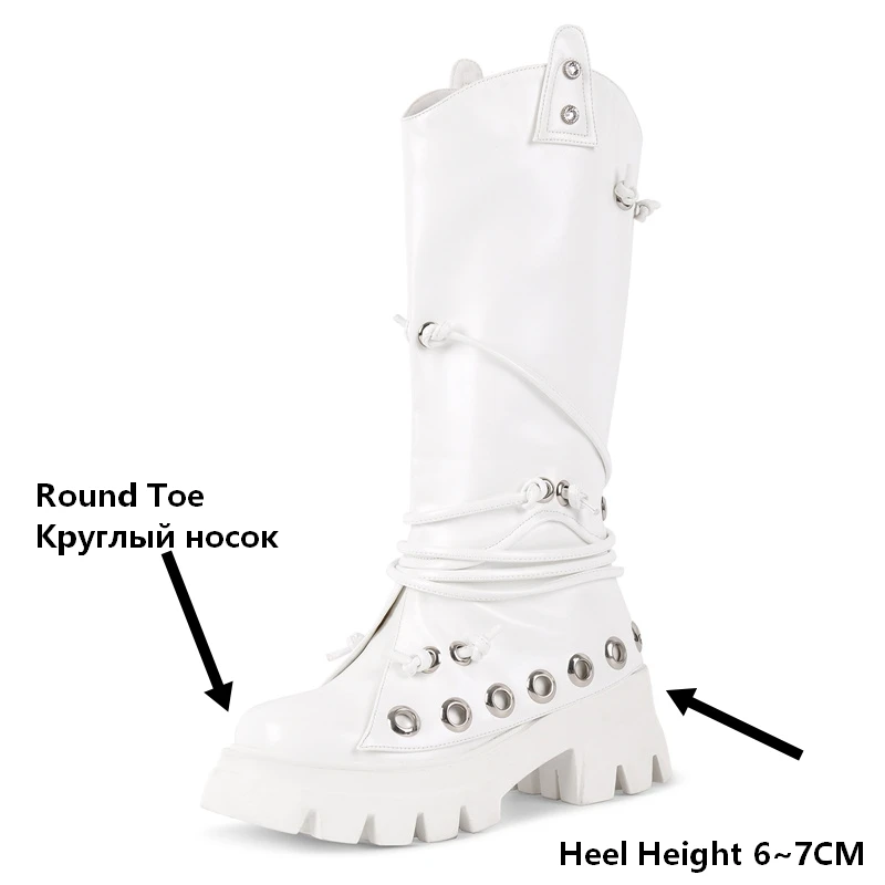 Women Platform Round Toe Studded Chunky Heel Knee High Boots Pull On Mid Calf Chunky Heel Punk Boots