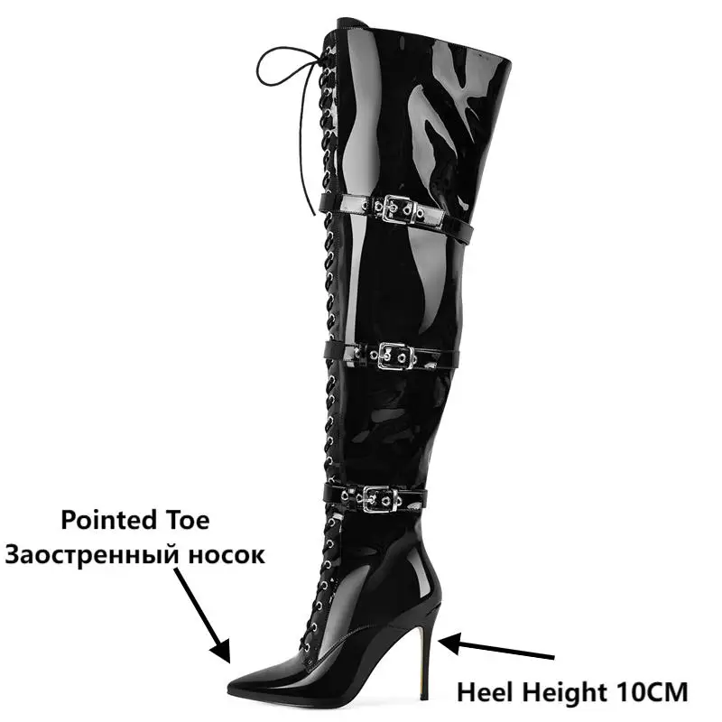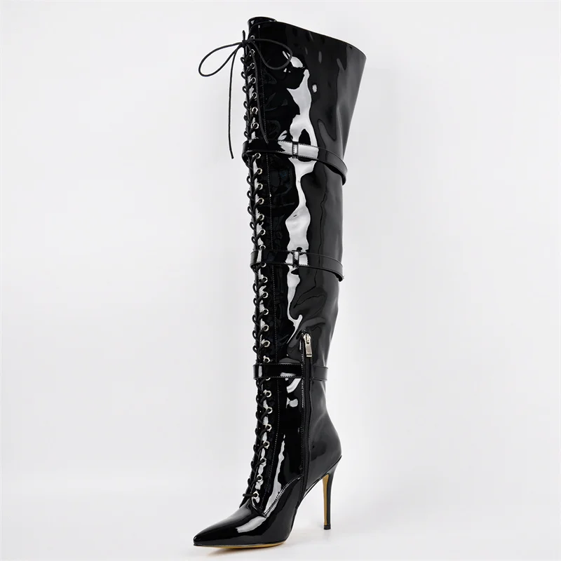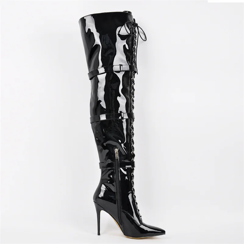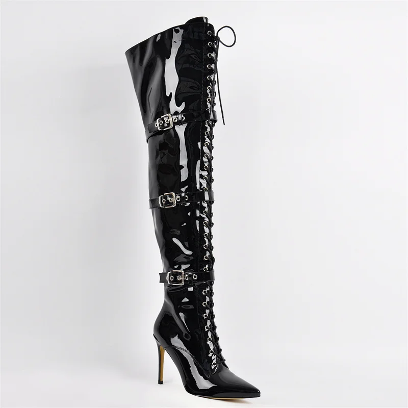 Onlymaker Women Pointed Toe Belt Buckle Over The Knee Boots Zipper Plus Size Sexy Patent Leather Wide Calf Thigh High Boots
