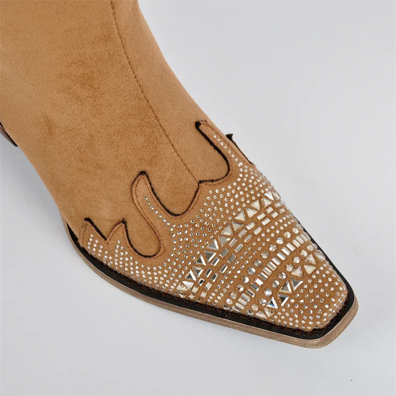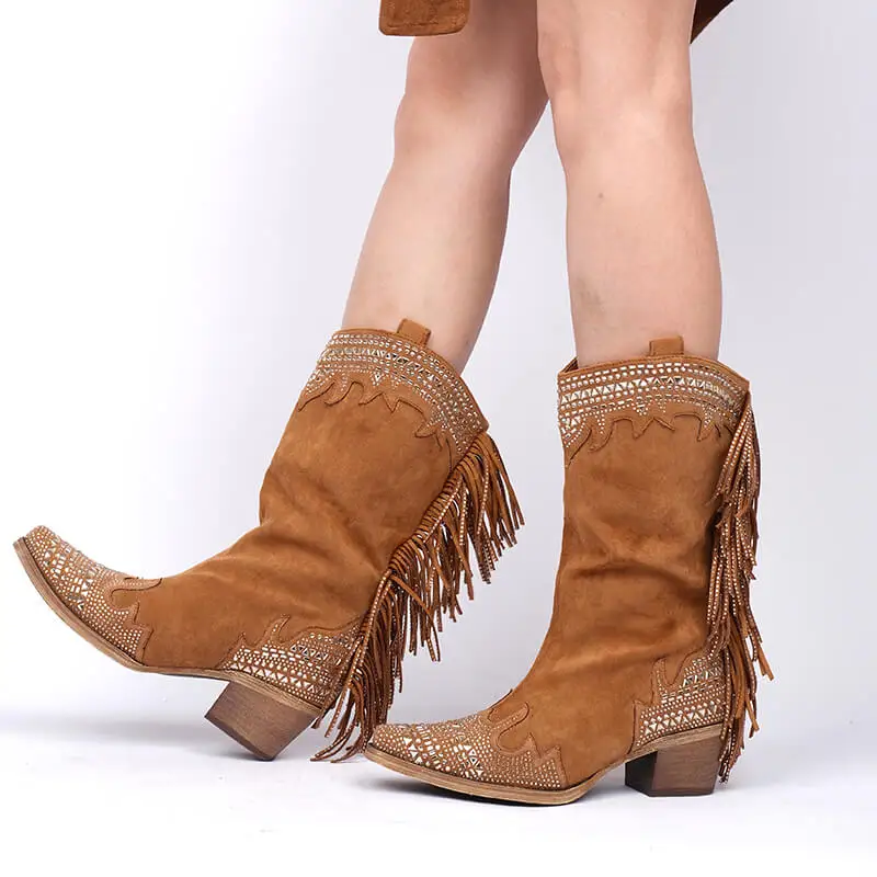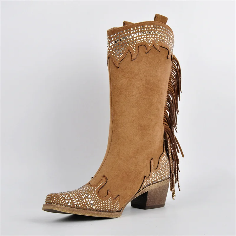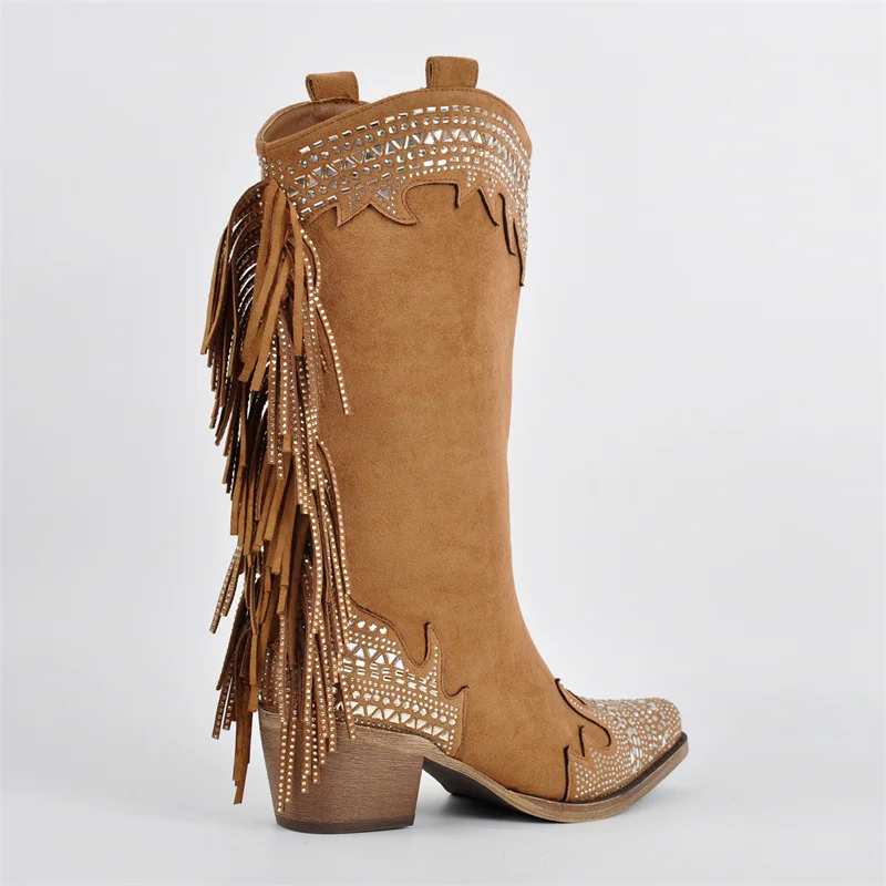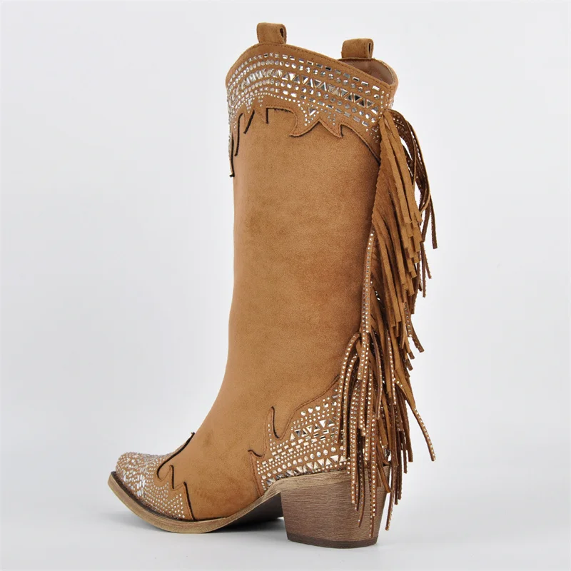 Women Pointed Toe Fringe Side Zipper Retro Western Cowgirl Boots Fringed Chunky Heel Embroidery Cowboy Boots