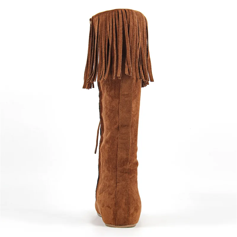 Women Round Toe Lace Up Faux Suede Fringe Knee High Boot Side Zipper Chuny Heel Flat Boots