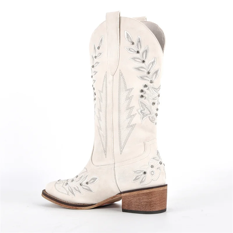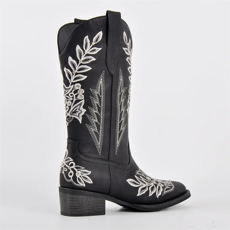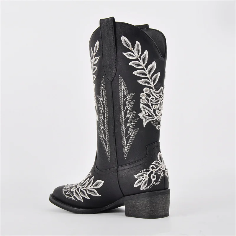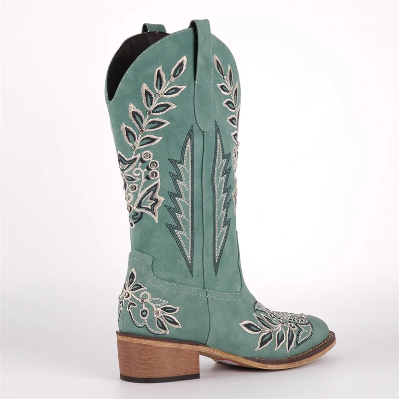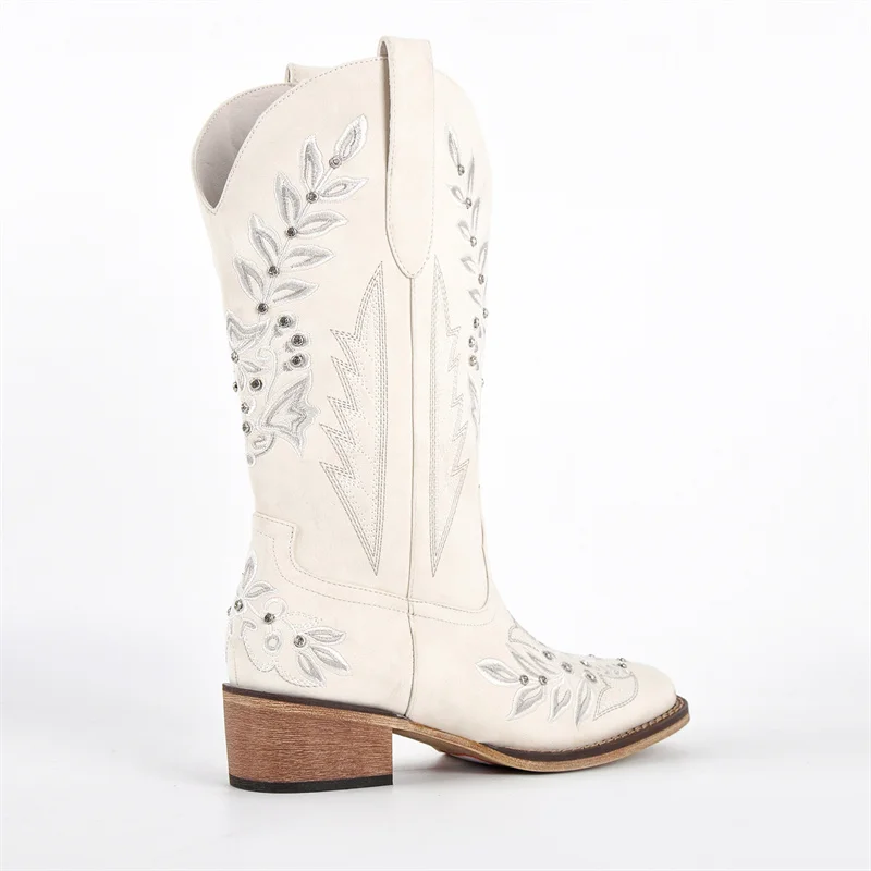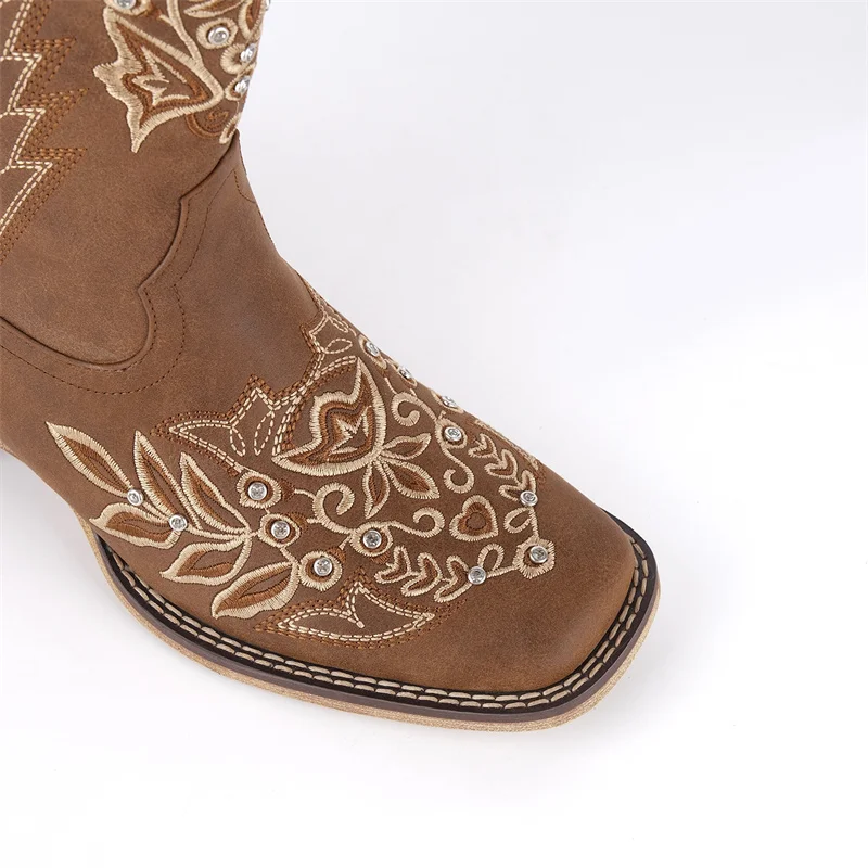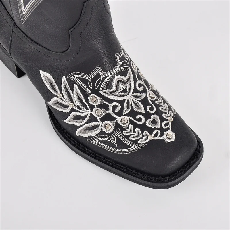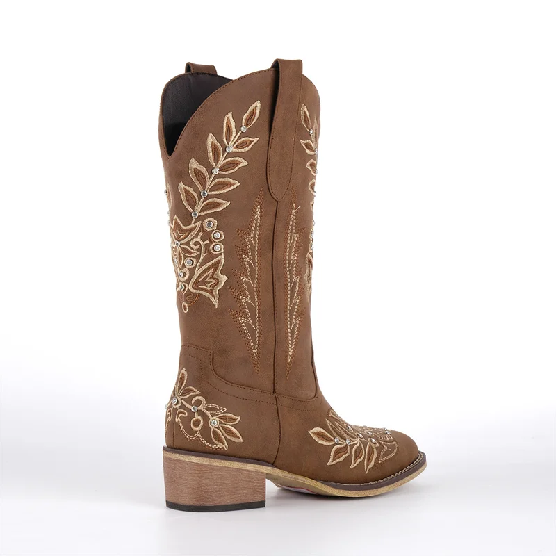 Women Square Toe Floral Rhinestones Embroidery Western Boots Pull On Knee High Chunky Heel Embroidered Boots