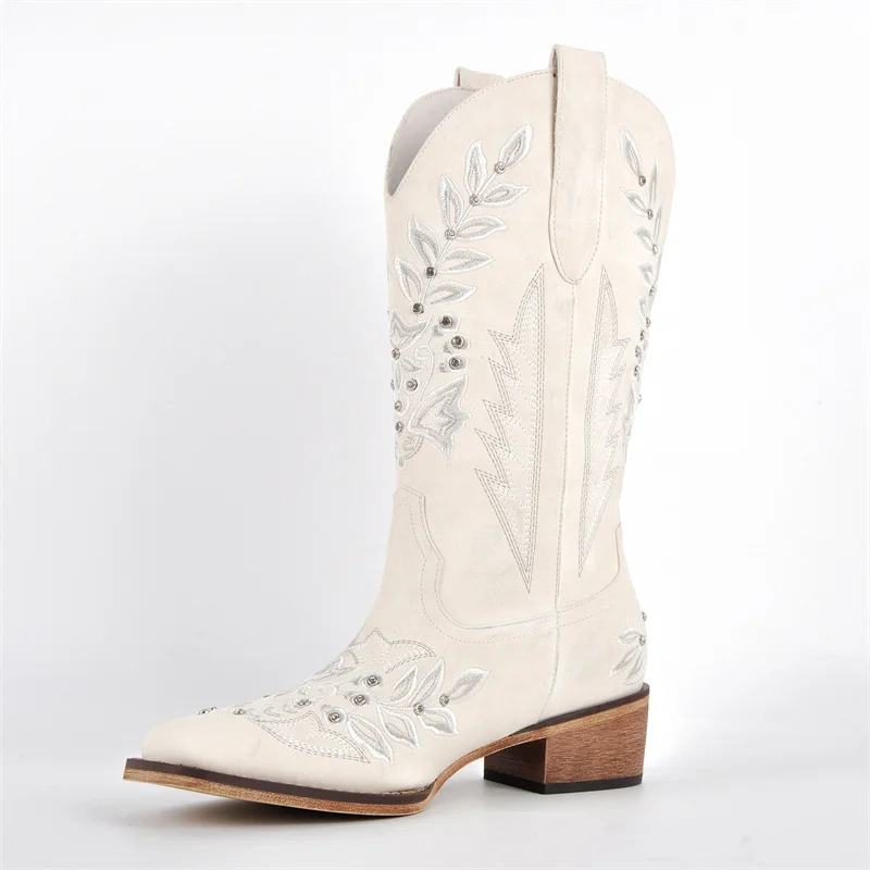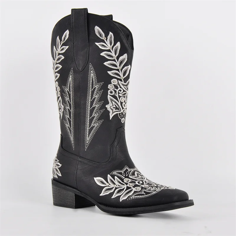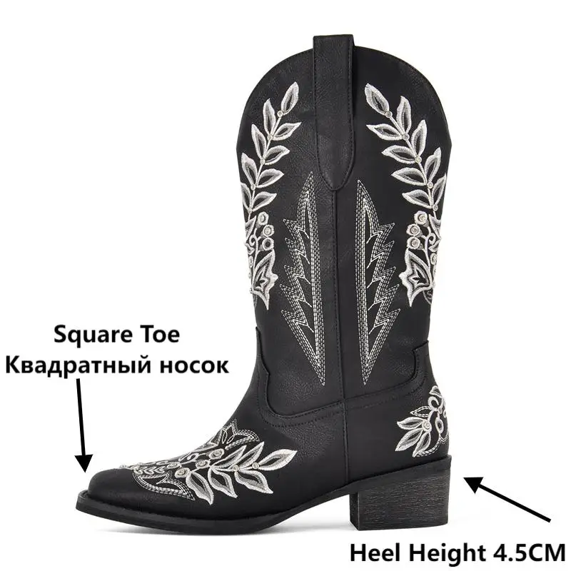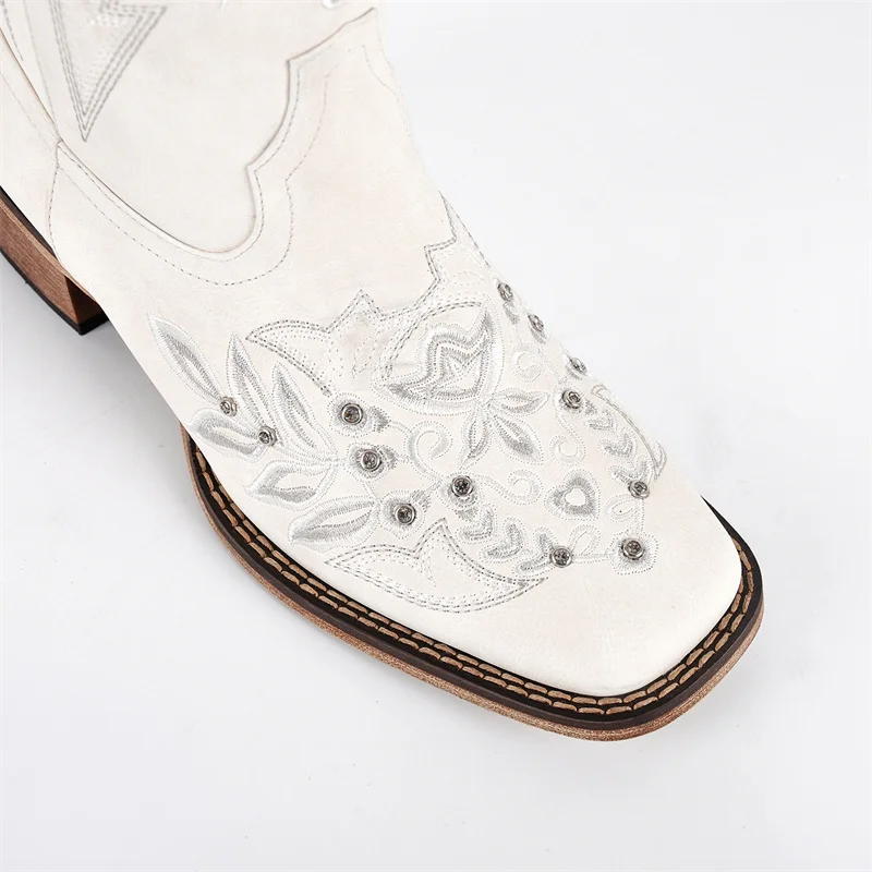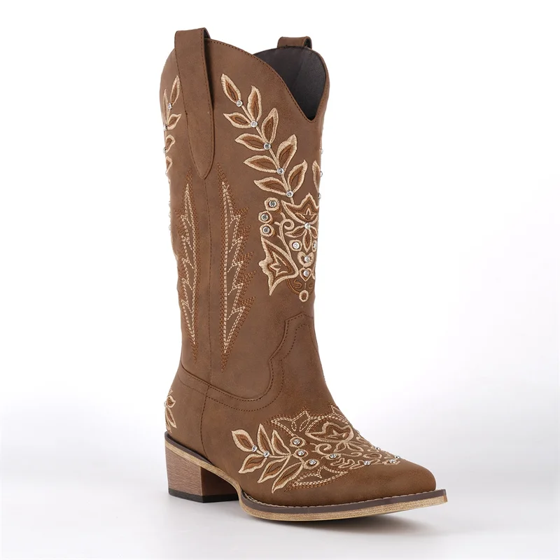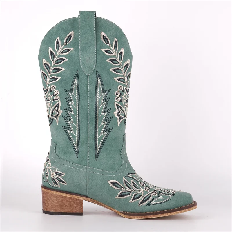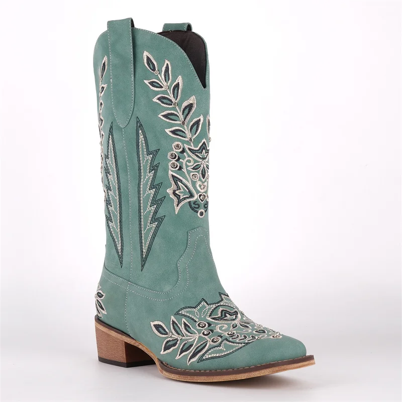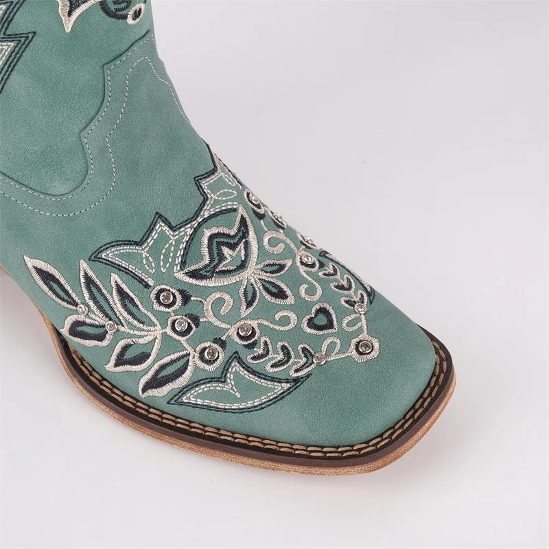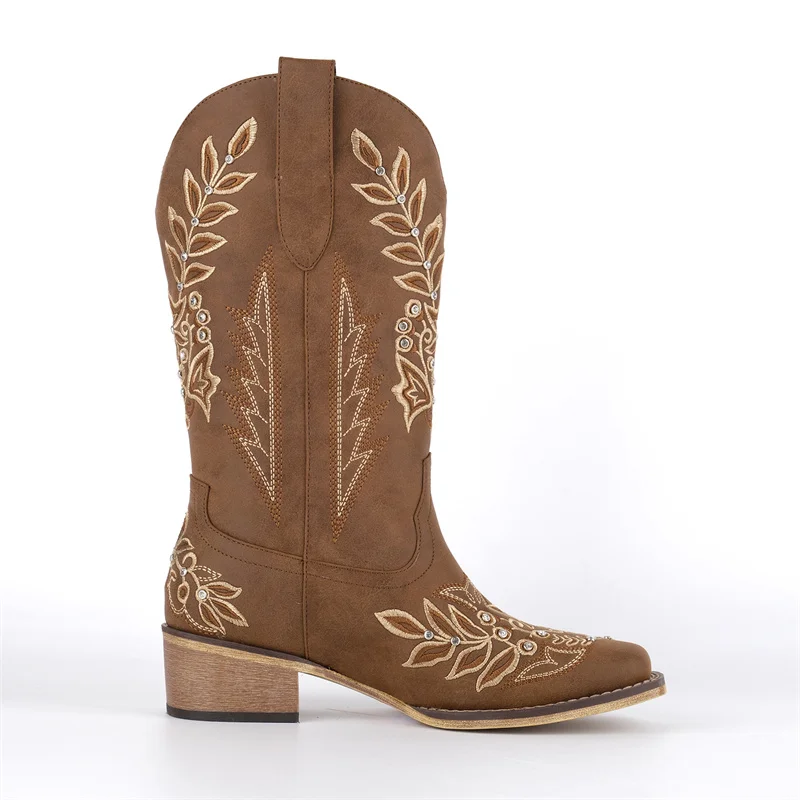 Women Square Toe Floral Rhinestones Embroidery Western Boots Pull On Knee High Chunky Heel Embroidered Boots