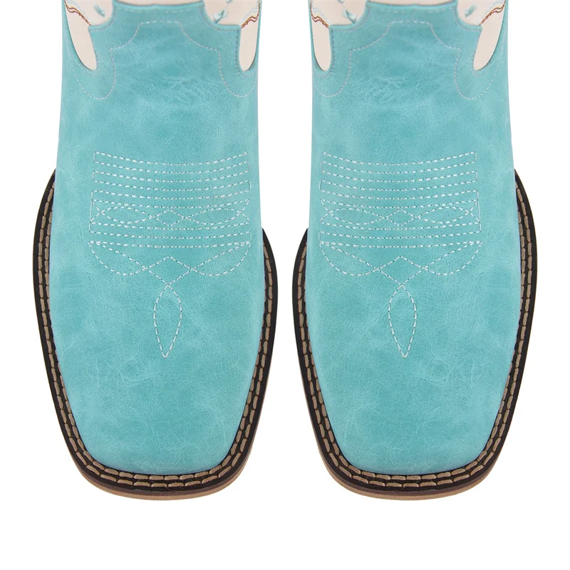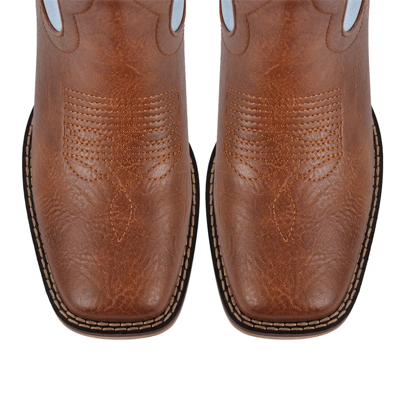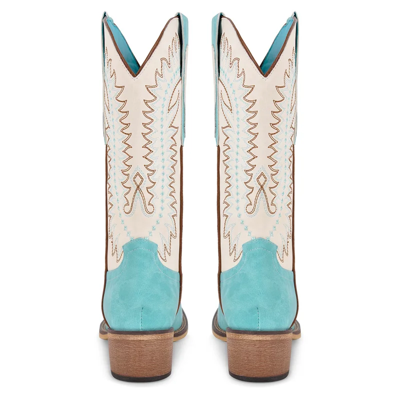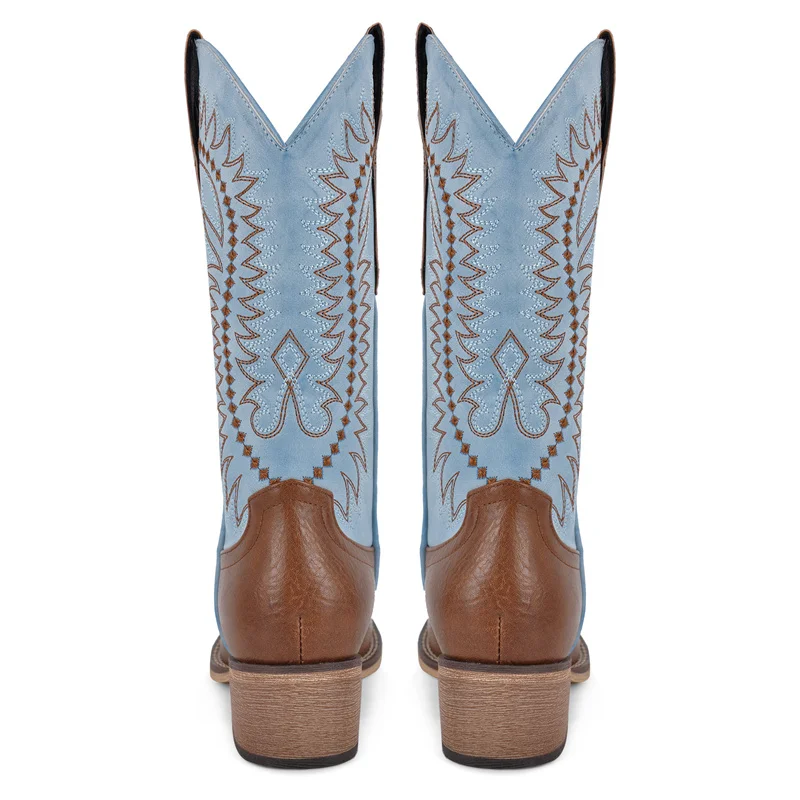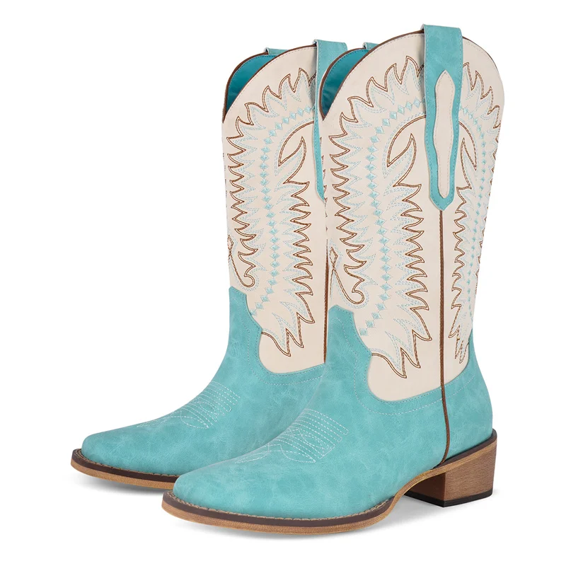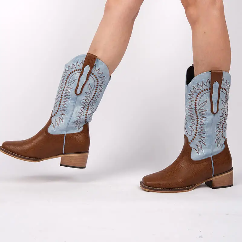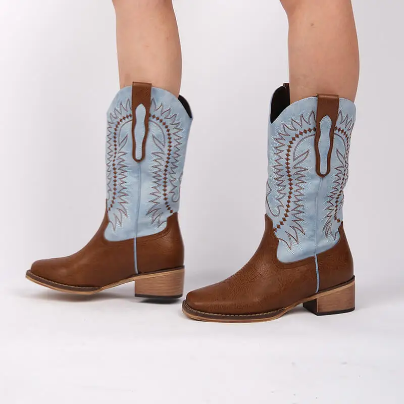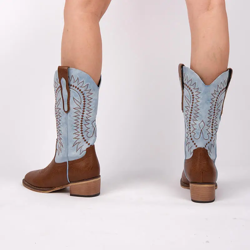 Women Square Toe Western Cowboy Boots Embroidered Mid--Calf Block Heel Fashionr Cowgirl Boots