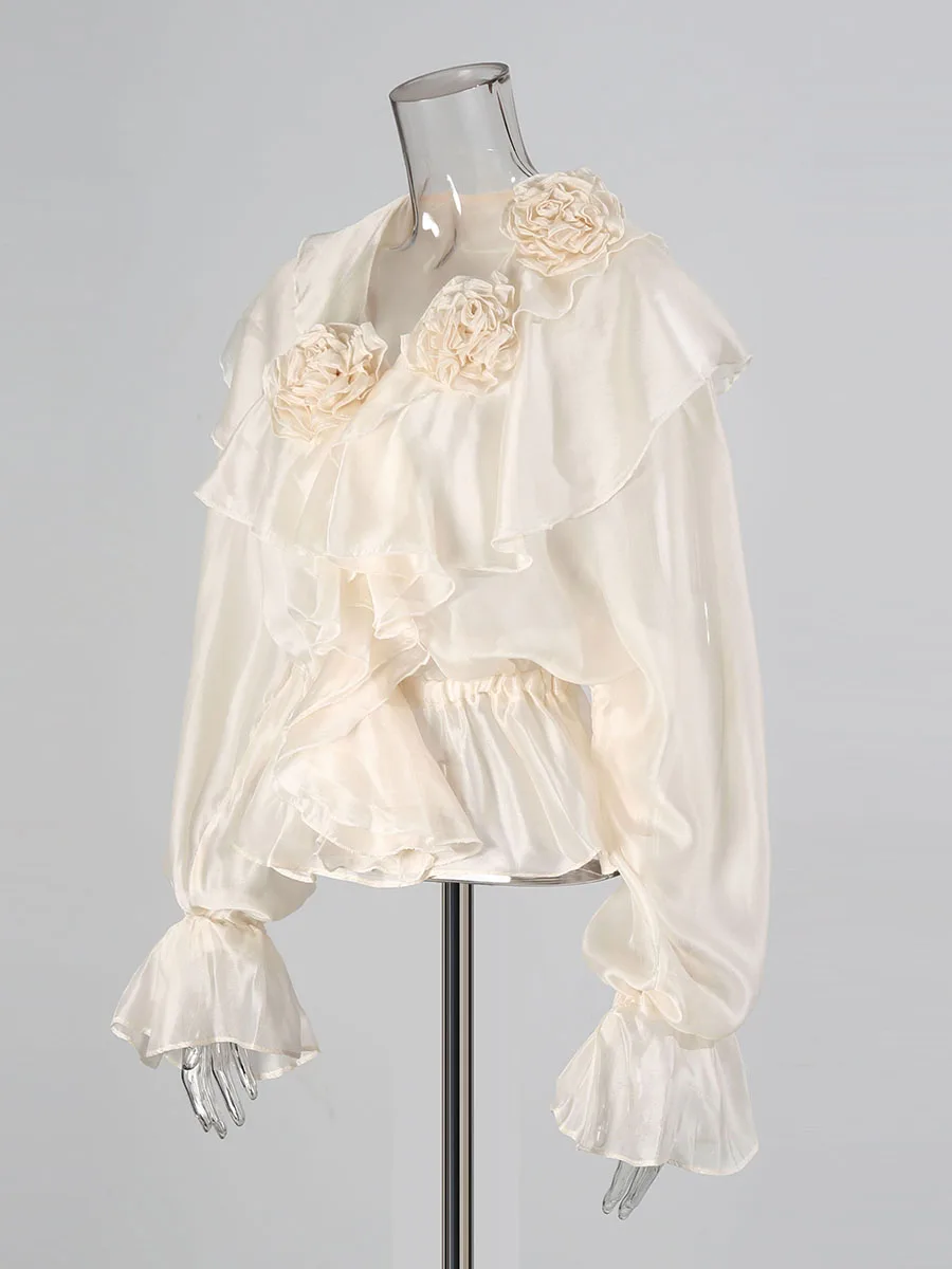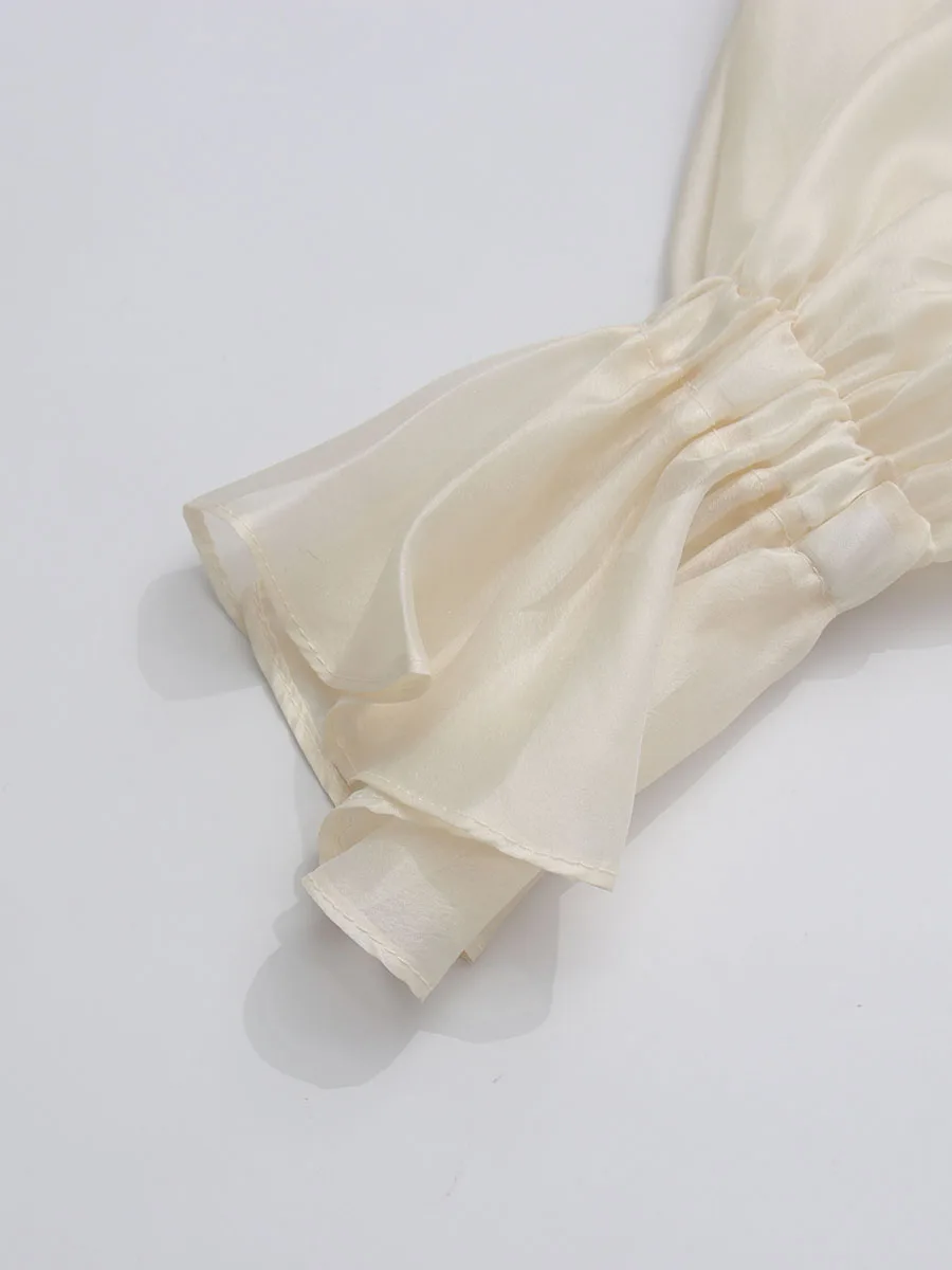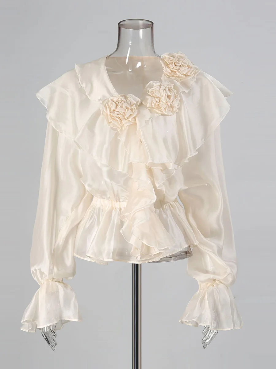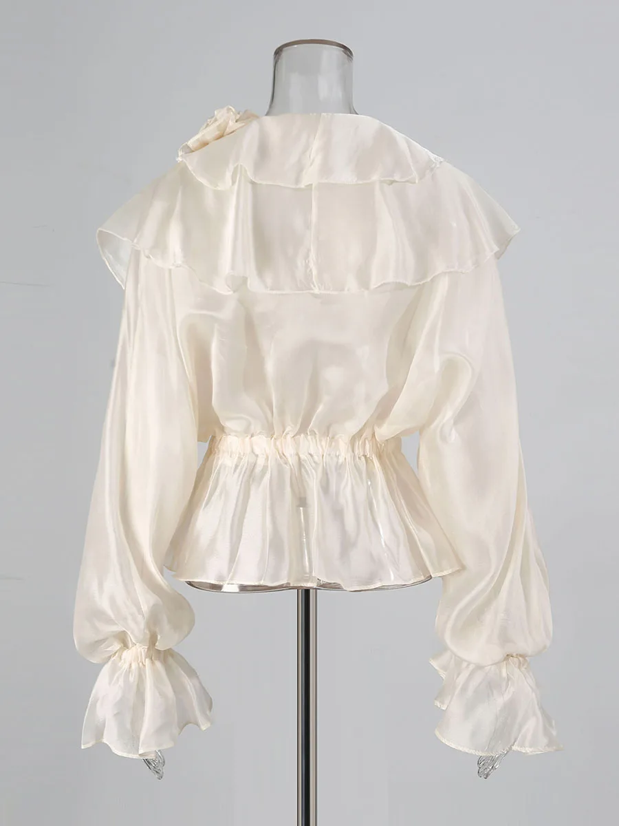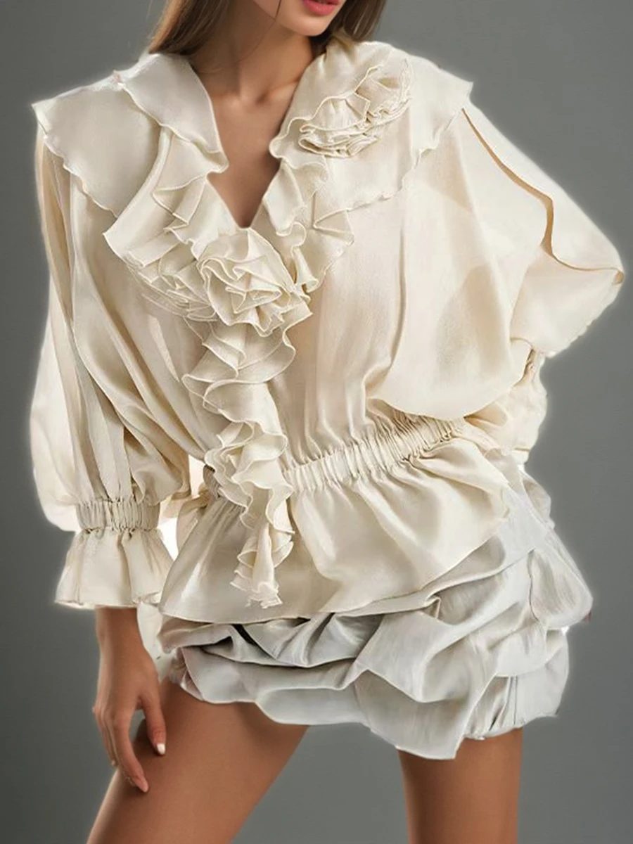 Solid Loose Spliced Fungus Folds Blouses for Women V Neck Long Sleeves Elastic Waist Casual Blouse Female Clothing