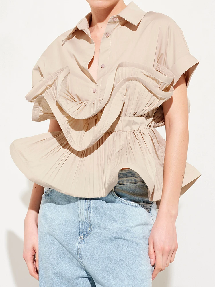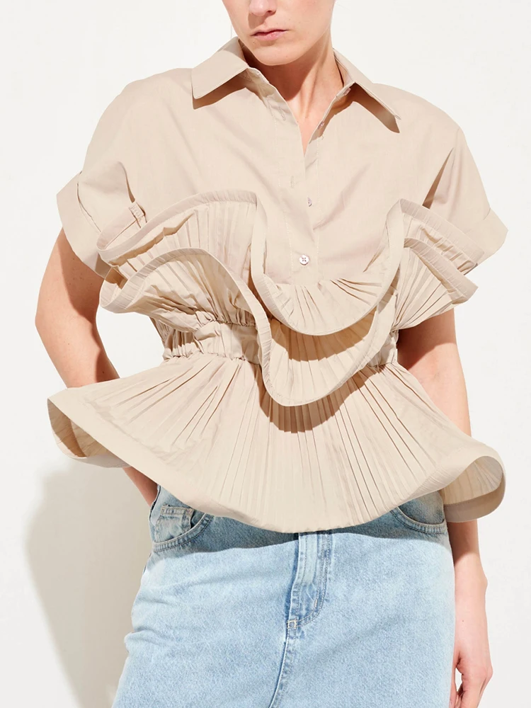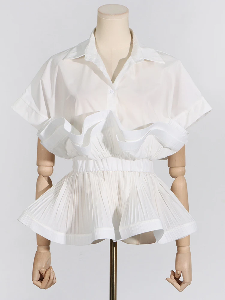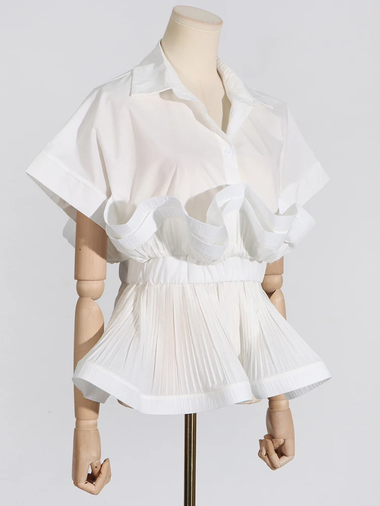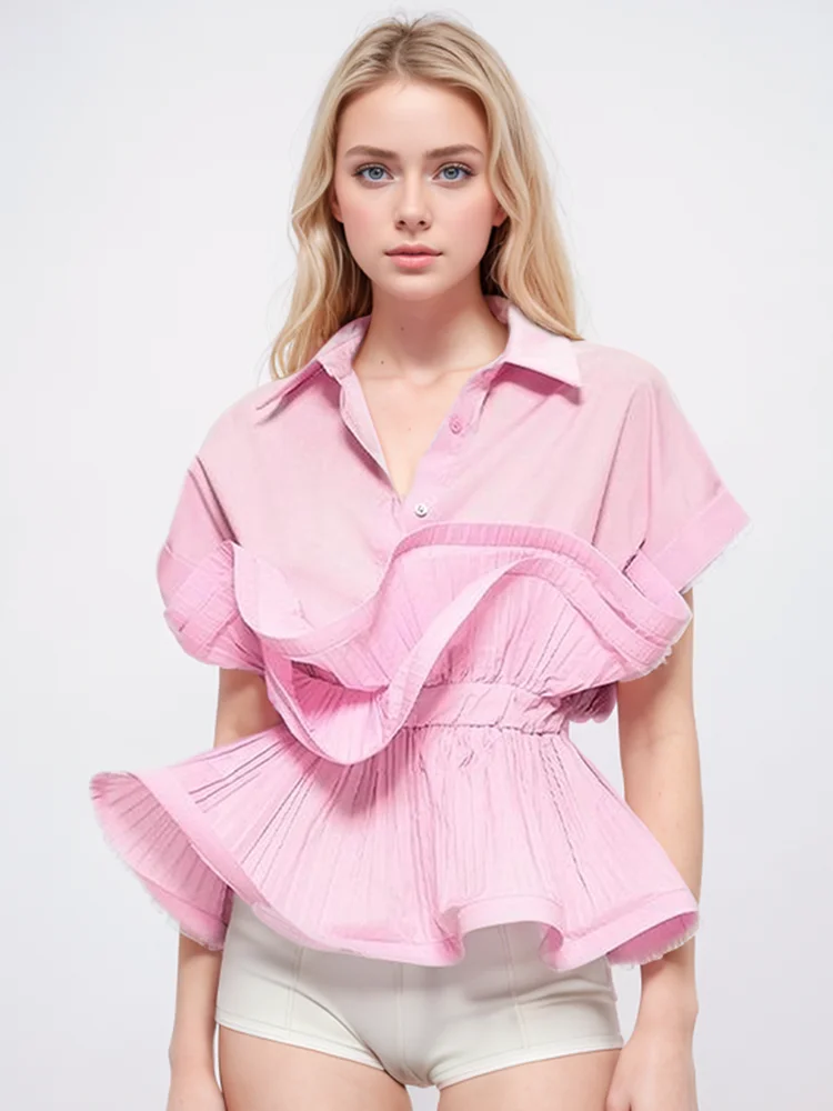 Solid Patchwork Folds Casual Shirts For Women Lapel Short Sleeve Spliced Single Breasted Minimalist Blouses Female Fashion