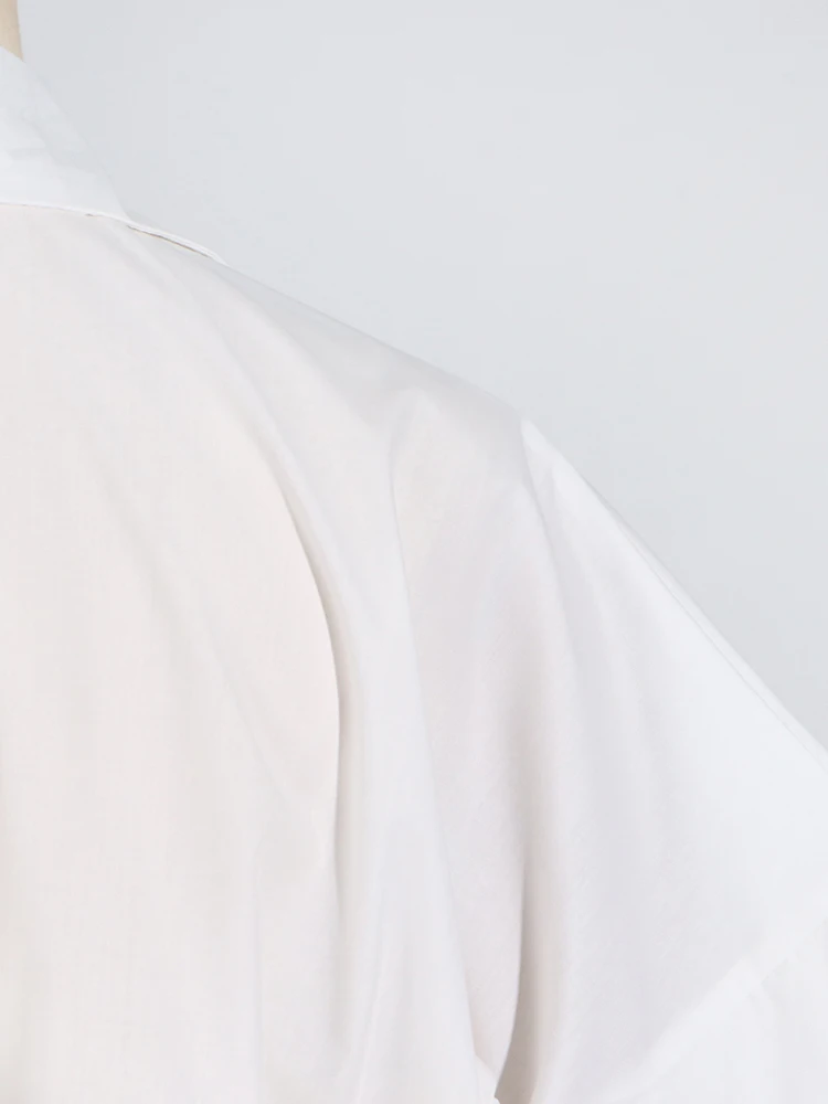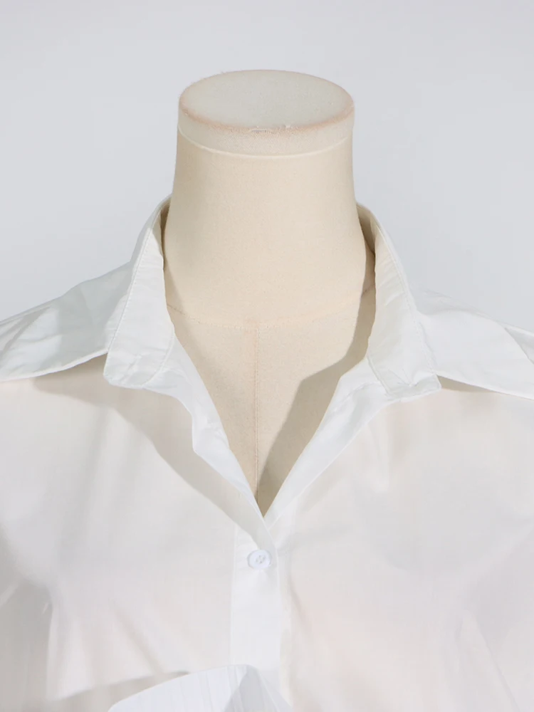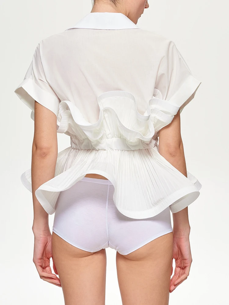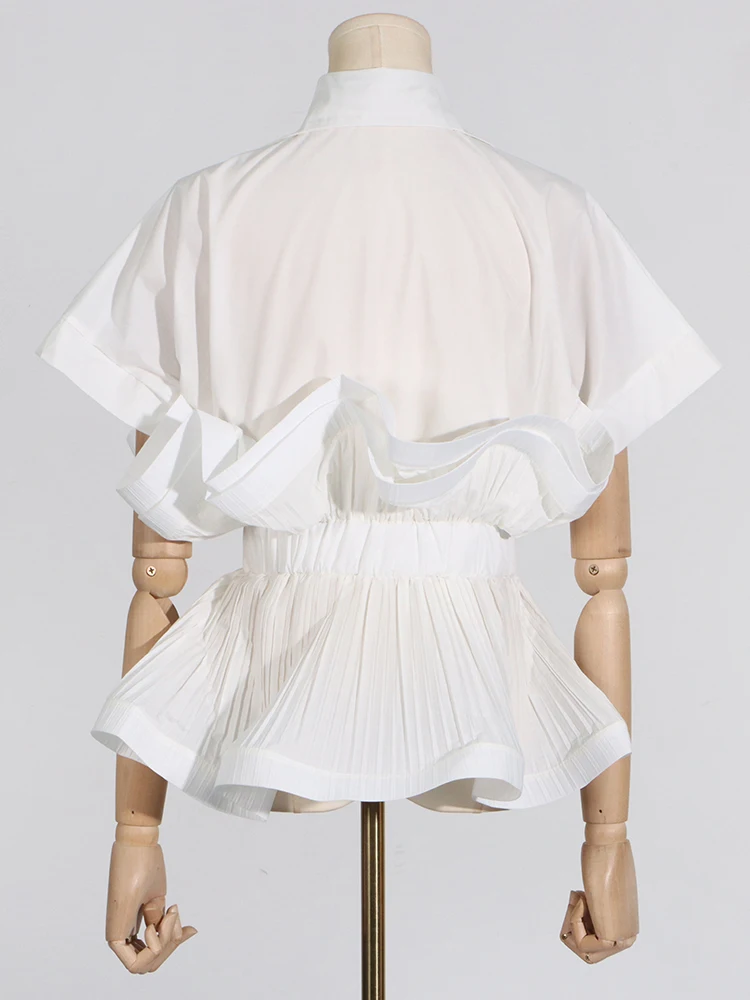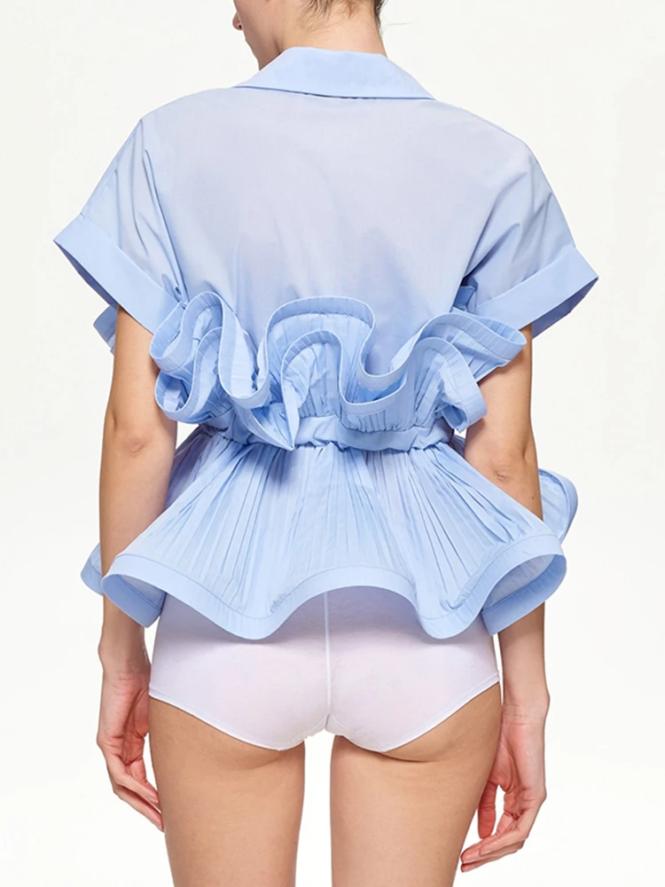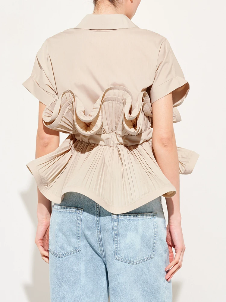 Solid Patchwork Folds Casual Shirts For Women Lapel Short Sleeve Spliced Single Breasted Minimalist Blouses Female Fashion