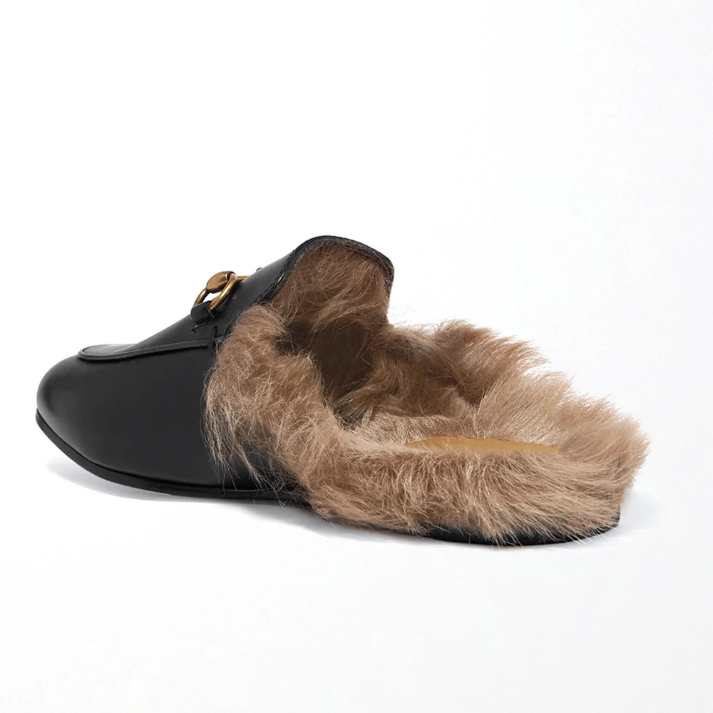 Wide Fit Black Fluffy OEM Flat Closed Toe Mules Women Shoes Buckled Backless Mule Loafers With Fur