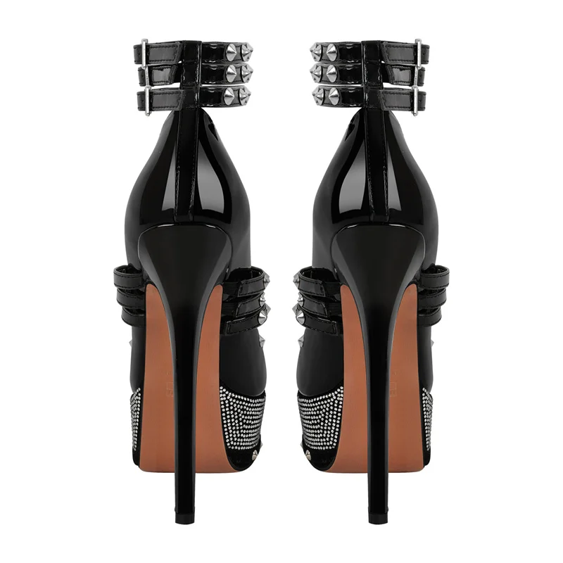 Women Rivet Platform Patent Leather Rhinestone Pumps High Heeled Big Size Ankle Straps Women Stiletto Pumps