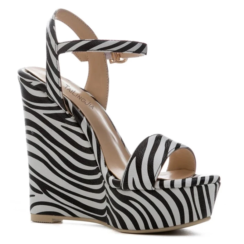 Women Zebra PU Leather Buckle Strap Girls Shoes Open Toe Platform Wedge High Heels Sandals
