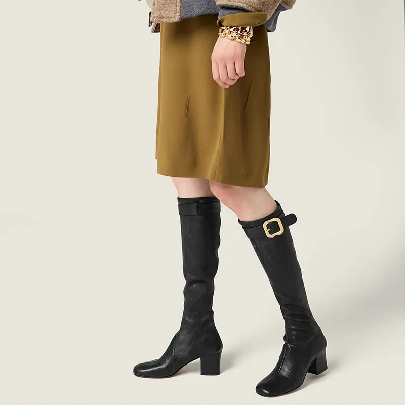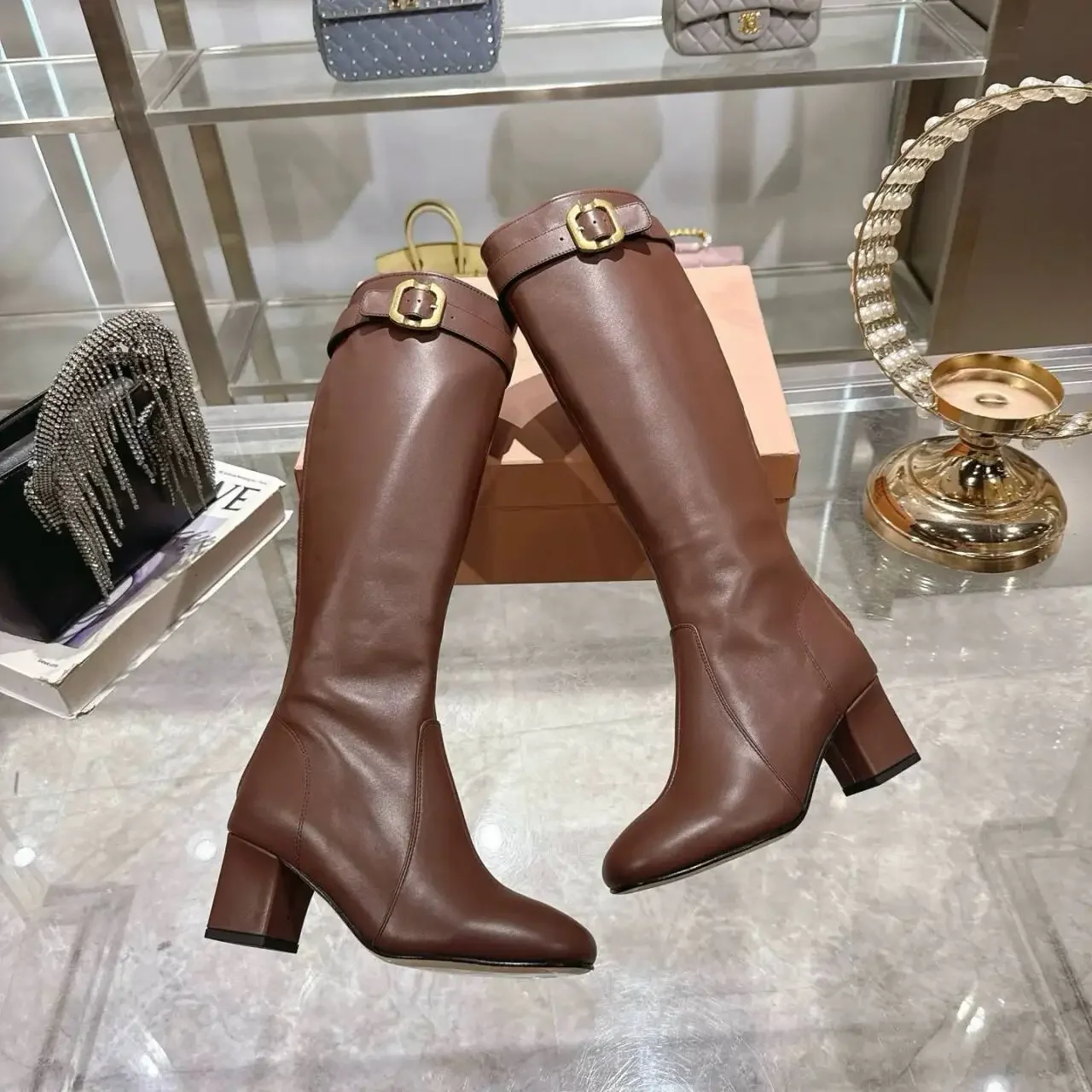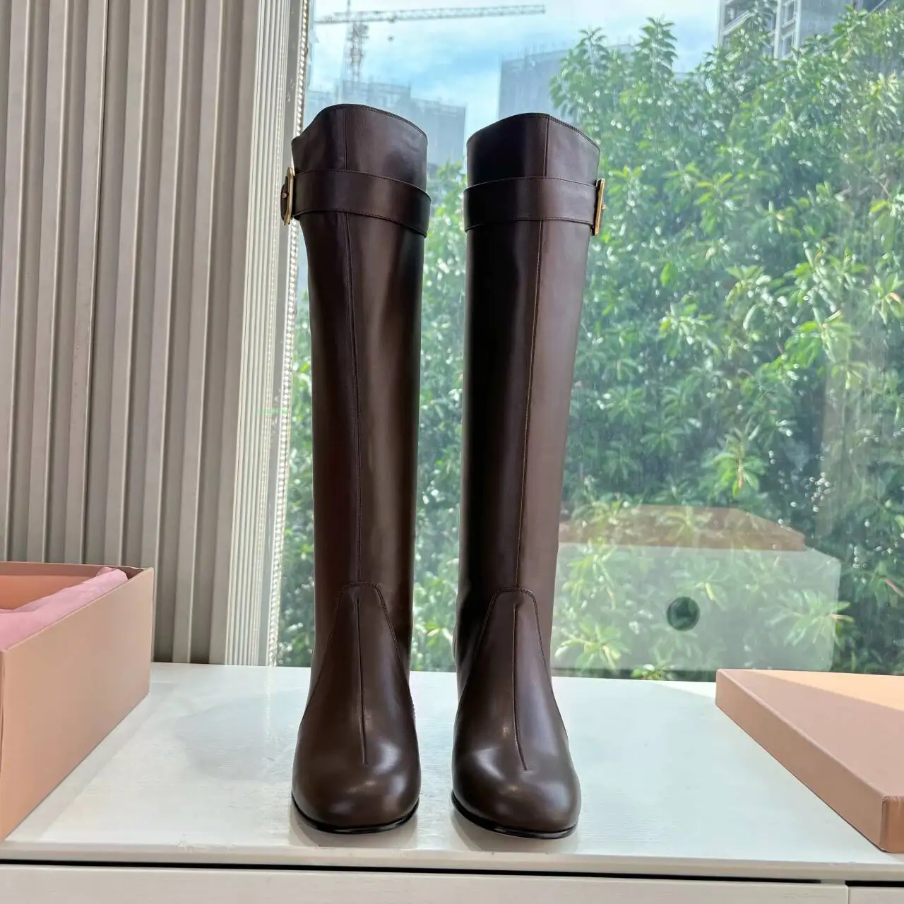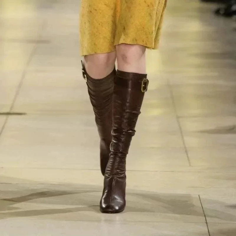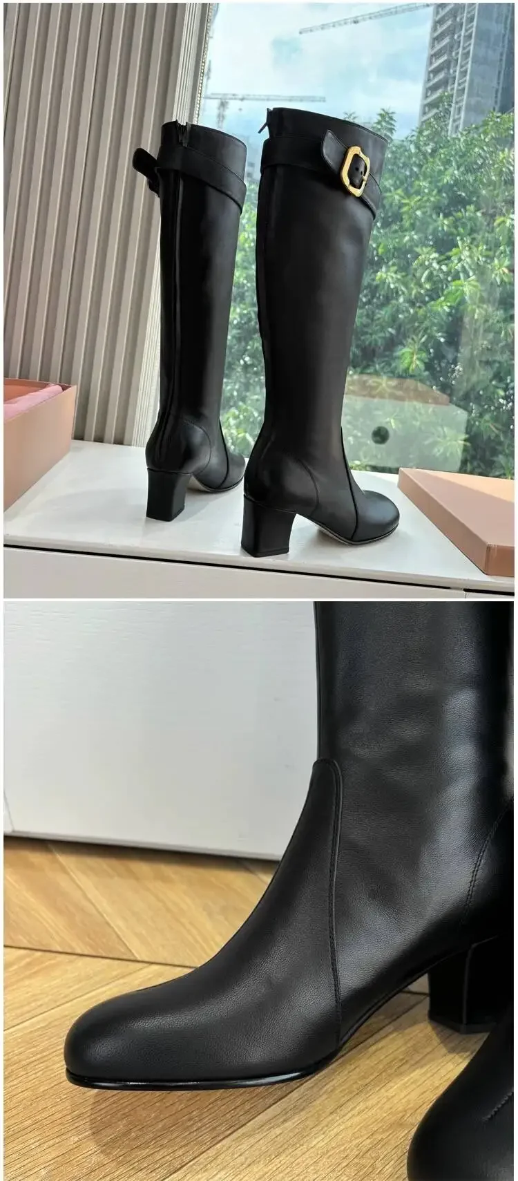 Women's New Thick High Heels Knee High Boots Autumn and Winter Round Toe Buckle Fashionable Mid Heel Boots Women's Short Boots